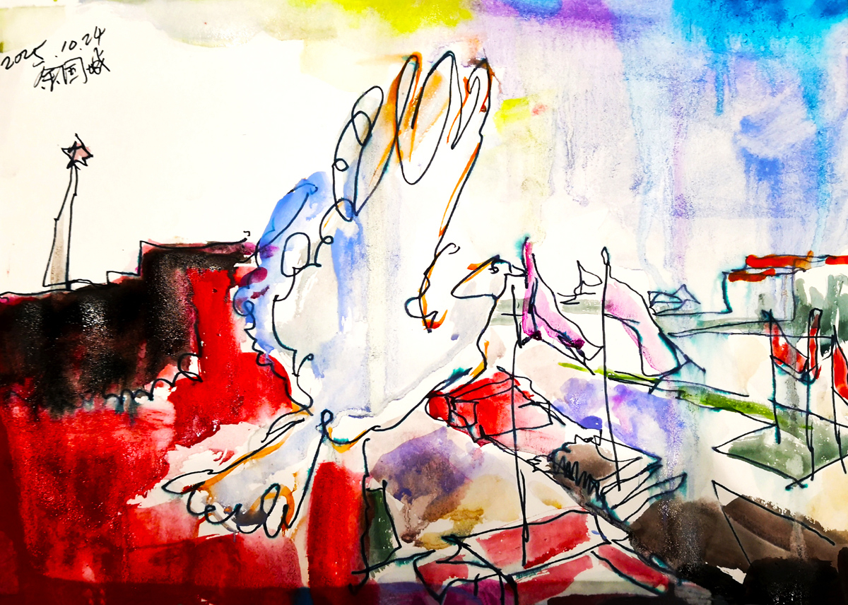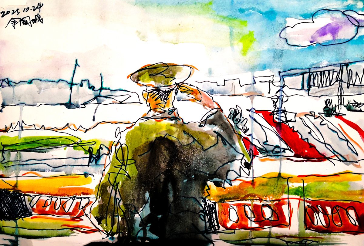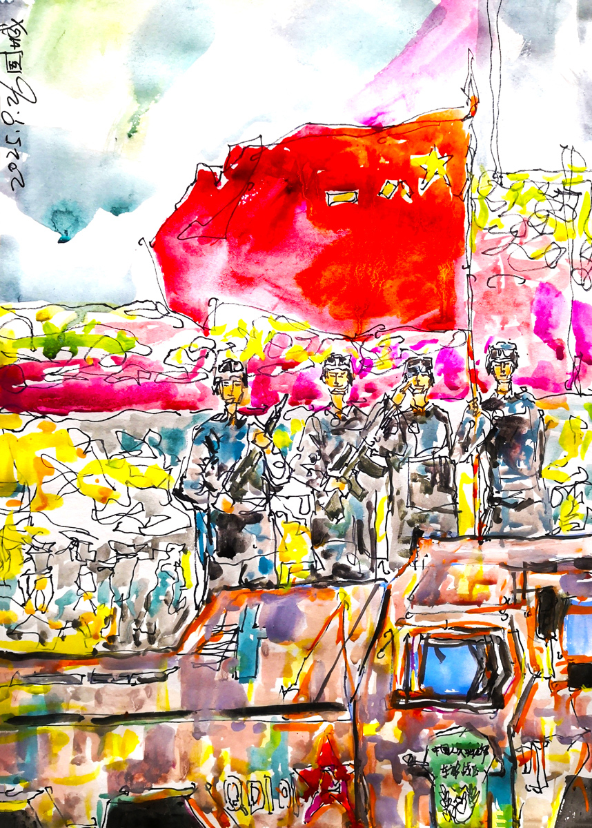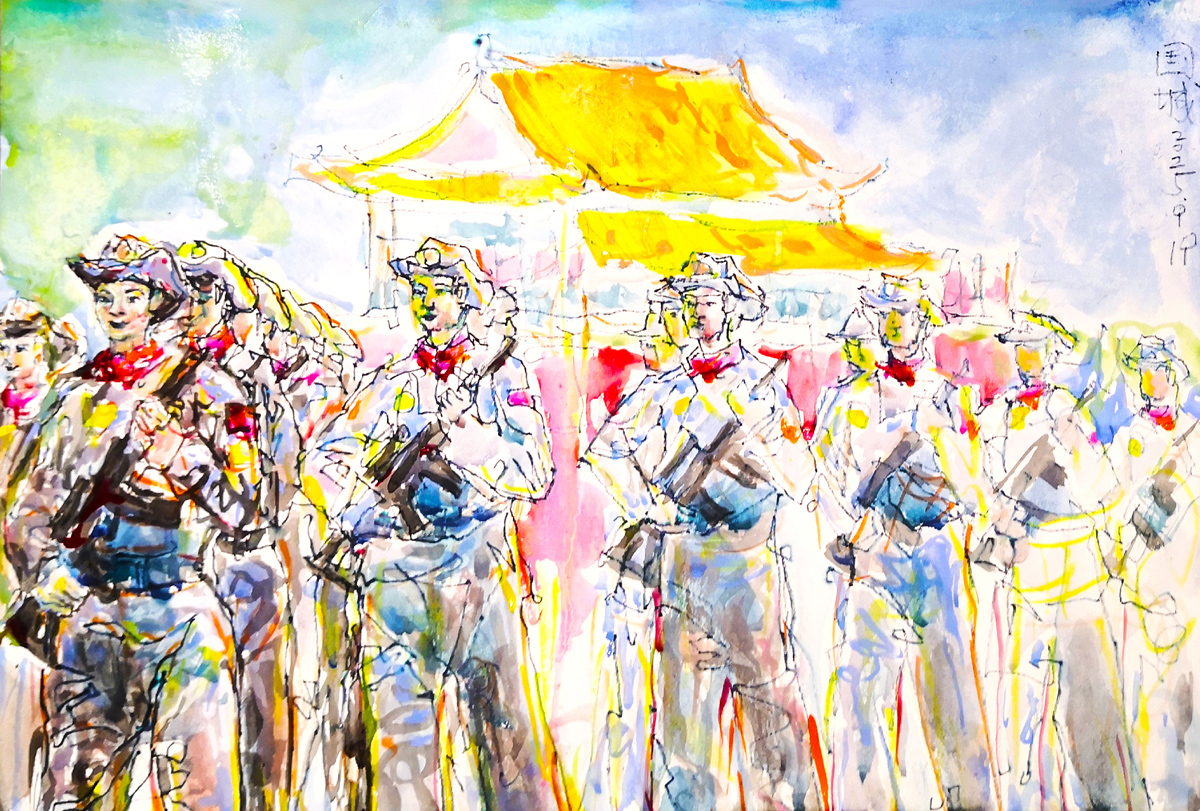 余先生之画境,是“画中有诗”的意境,亦是“诗中有画”的哲思。他以画笔为针,在传统与现代之间穿梭,让观者既能感受到阅兵仪式的庄严,又能体会到集体活动的温暖。这般“笔落惊风雨”的豪情,正是先生对“酒不醉人人自醉”的绝妙诠释——非关杯盏,全在笔墨之间。