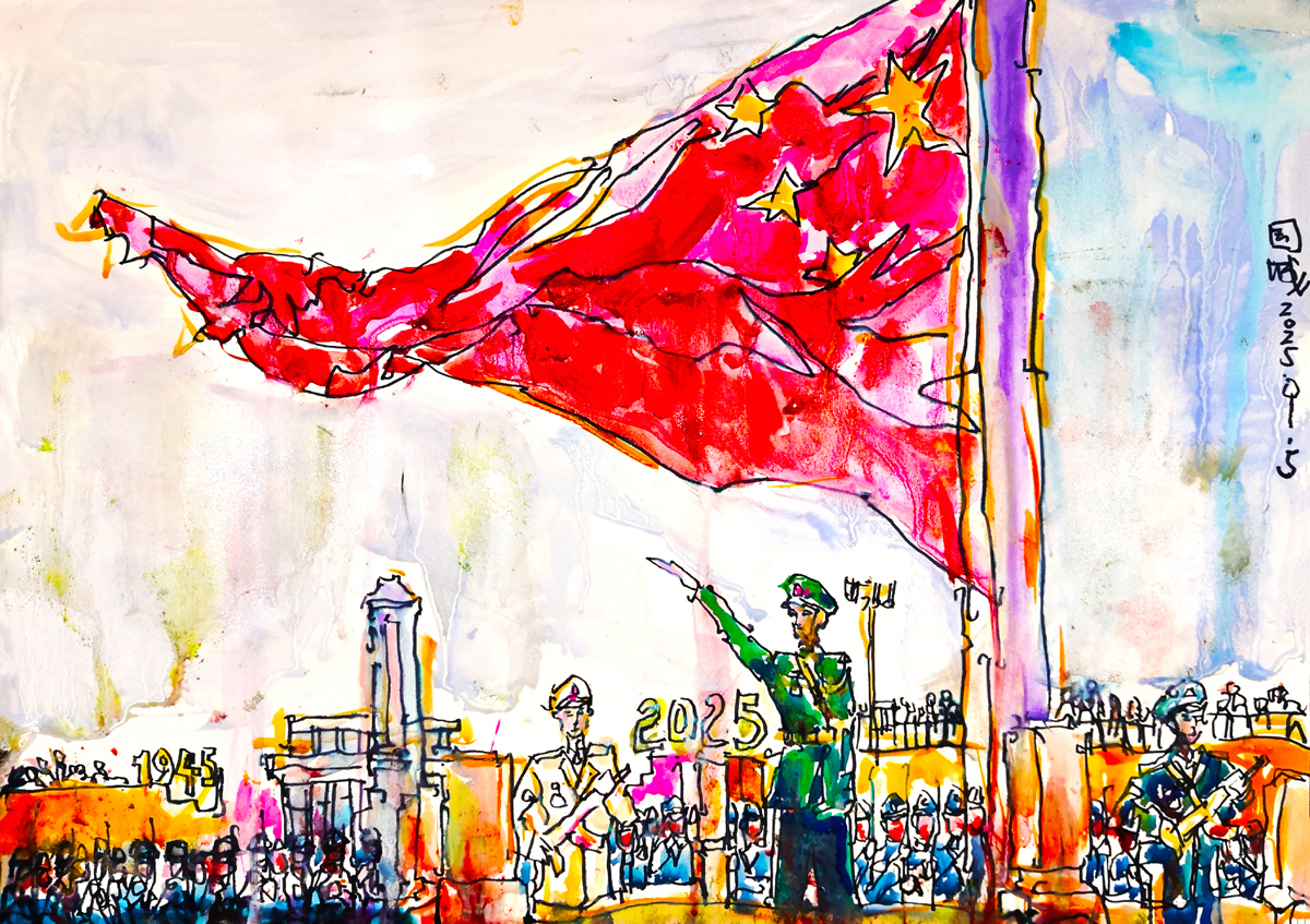 余国城先生以笔为舟,载岁月长歌入画。其《盛世华章》中,千军万马般的制服队列在靛蓝与橙红间奔涌,恰似江河入海,既有“大江东去”的磅礴,又含“细水长流”的绵长。他独创“破界晕染”技法,在《红旗漫卷》里,五星红旗的朱砂红与背景青灰的云水墨色相破,形成“云破月来花弄影”的朦胧诗境。