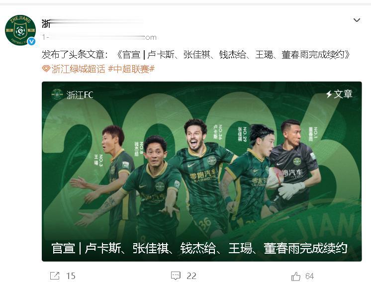 当浙江队官宣卢卡斯、张佳祺、钱杰给、王瑒、董春雨五大核心球员续约时,中超转会市场的“暗流”瞬间变成巨浪,为什么这样说?这支上赛季差点掀翻传统豪门的黑马,用一纸合同向全联盟宣告:我们要把“稳定”变成争冠的底气!他们能做到吗?
