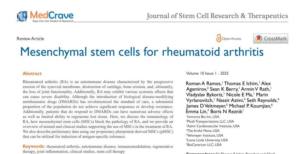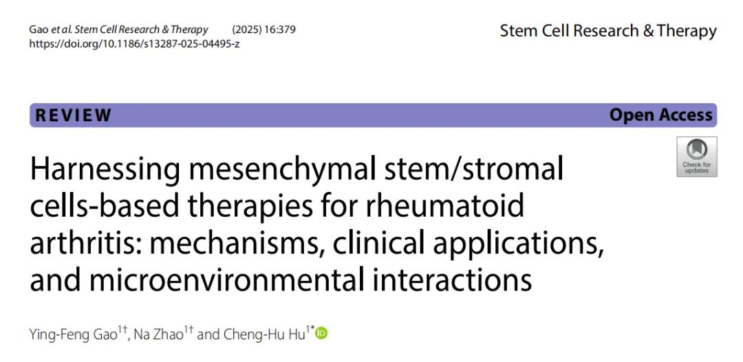 [6] Gao YF, Zhao N, Hu CH. Harnessing mesenchymal stem/stromal cells-based therapies for rheumatoid arthritis: mechanisms, clinical applications, and microenvironmental interactions. Stem Cell Res Ther. 2025 Jul 16;16(1):379.