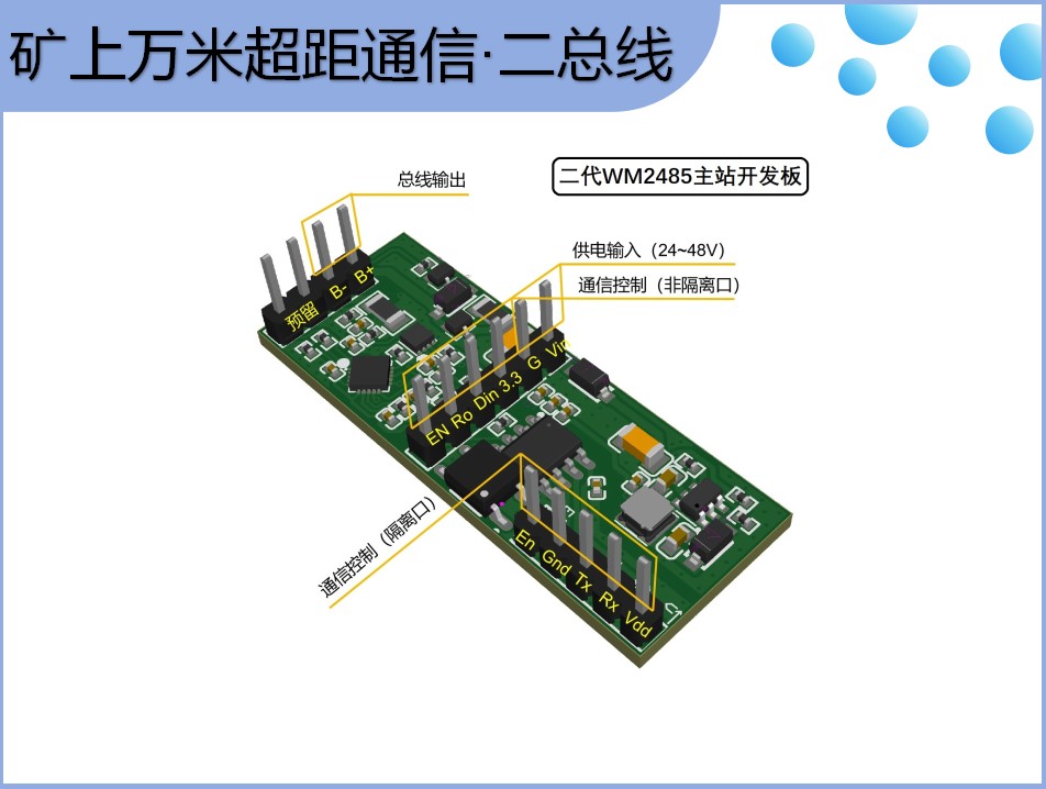 H2:痛点场景+解决方案 痛点场景二聚焦于远距离与极端环境的挑战。矿业、野外作业等场景对通信距离与抗干扰要求极高,传统有线系统往往需要中继或专门防护措施,成本与维护压力很大。WM2485 开发板具备万米级通信能力,HT2485-150ZT 针对高温极端工况提供更稳健的直流载波方案,实现150℃环境下的可靠传输。XF2485A 芯片具备内置开关键控(OOK)调制/解调能力,零外围电路即可工作,降低现场调试难度。XM620 主机+ XF2485 无极性载波的组合能实现“供电+通信”的统一布线,极大地减少防护与布线成本。这样不仅能在矿山、野外灌溉、电子围栏等场景提升系统线缆利用率,还能在远距离传输中保持较高的数据更新速率。除此之外,XM2BUS 的许多模组与开发板(如 WM2485、HT2485、XM332测试板、XM620开发板等)都提供了现成资源,帮助现场快速落地。🌍📡