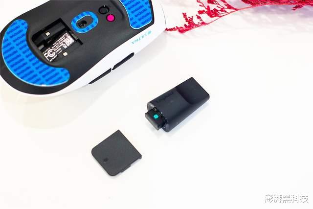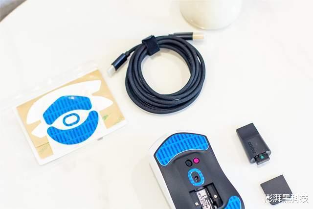 包装盒延续了以往的风格,没有太多花哨的,附带的配件有1.8米的编织线、nano接收器、一套备用脚贴外加防滑贴,日常使用和维护的需求都照顾到了。这个nano接收器值得说一下,它自带电量指示灯,不用通过电脑电脑软件也能一眼查看剩余电量,避免游戏时因没电导致突然断电断连。