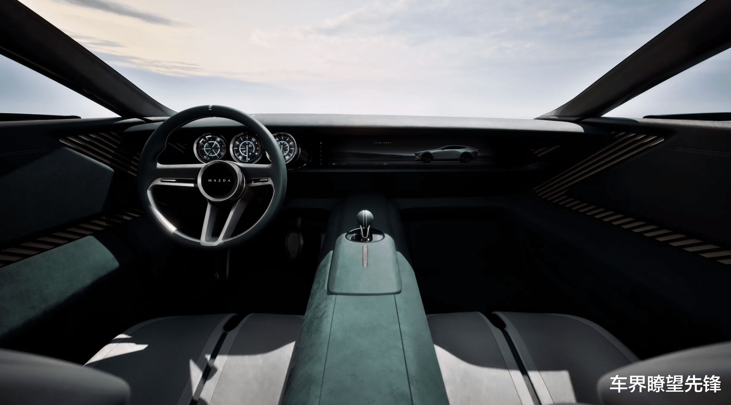 内饰的设计依然主打简约科技风,配备了三个独立的圆形数字仪表盘,复古风格的造型提升了内饰的活力,方向盘采用了极简式的三幅式方向盘,没有集合任何按钮,非常干净简洁,方向盘的中间为马自达的字母标识,但看着也像是一块显示屏。中控屏配备了一整块大屏,包括副驾驶的娱乐屏,给整合到了一起,既能合并显示,也可以单独进行操作。