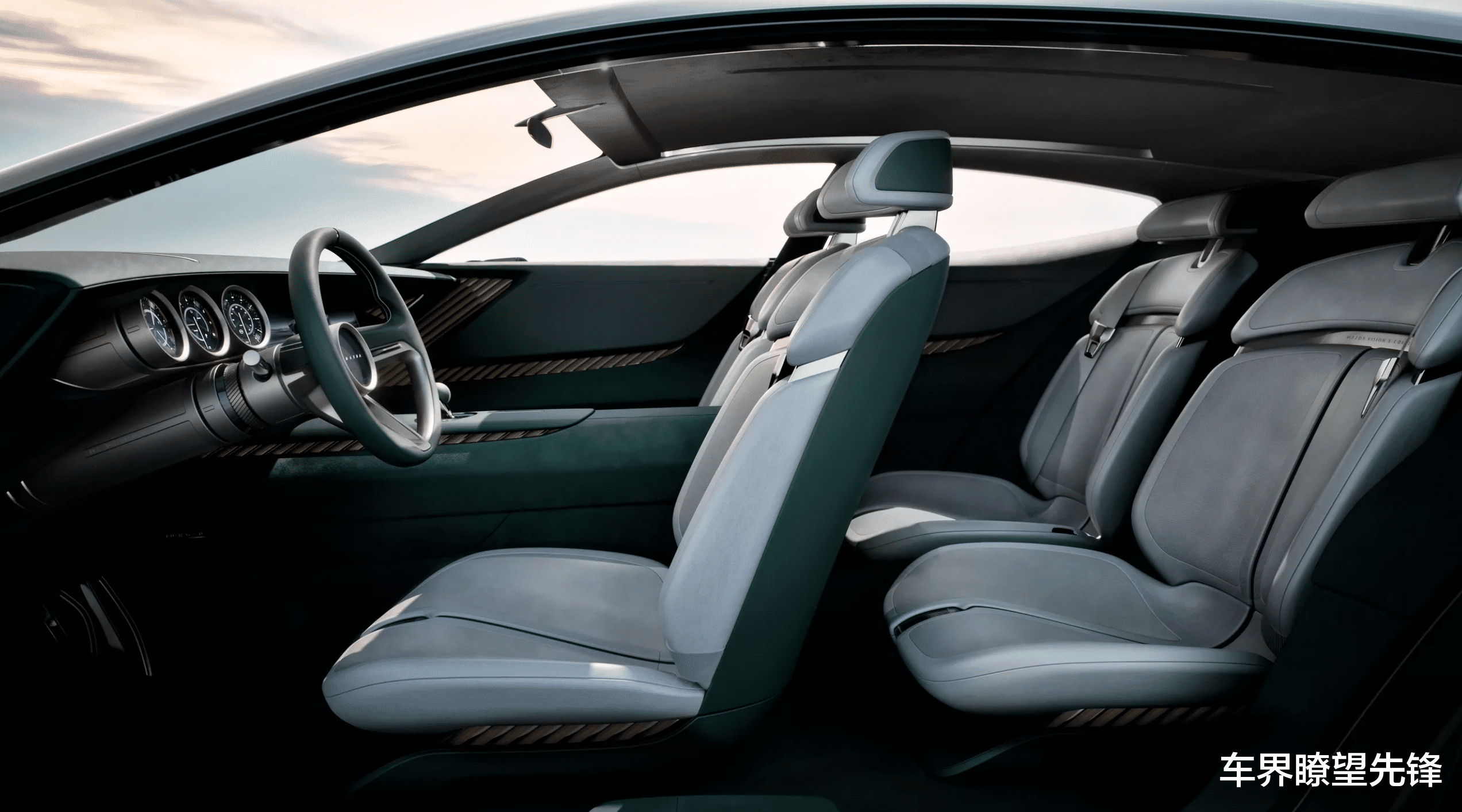 中控区域也非常简洁,类似皮革和麂皮材质进行了全包裹,然后只设置了一个椭圆形的换挡区域,换挡杆采用了类似棒球杆的设计。座椅采用了分体式设计,2+2的座椅布局,看上去后排空间不是太大。但内饰整体采用了双拼色设计,看上去还是挺舒适的。