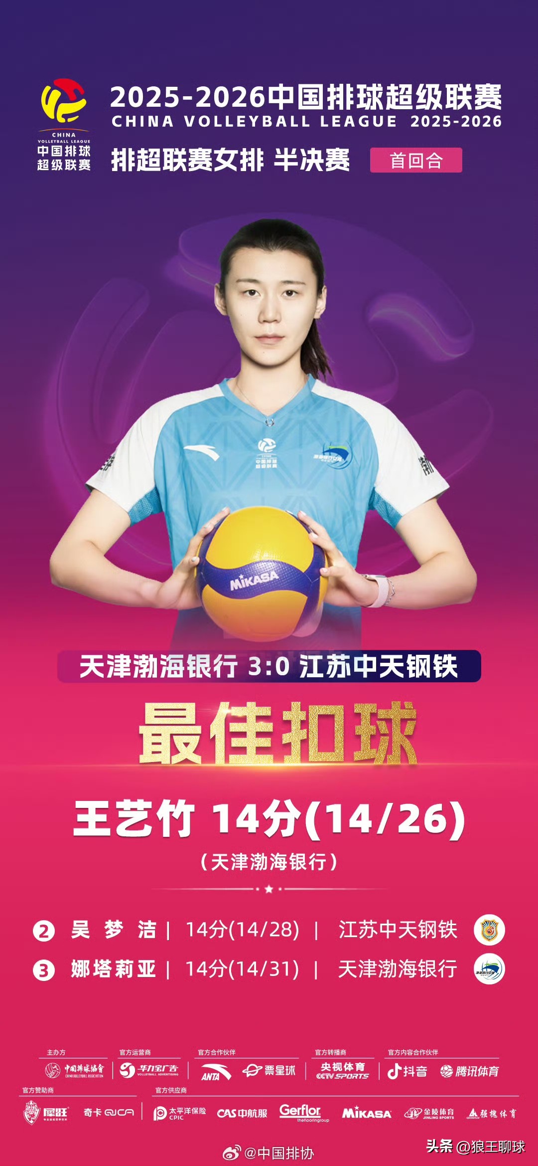 最佳扣球:王艺竹(天津渤海银行)14分(26扣14中0失误1被拦),扣球成功率54%、扣球效率50%,10次发球、0得分1失误,4次一传、1到位1失误,一传到位率25%、一传效率0,一传完美到位率25%,净得分:14-3失误被拦=11分。