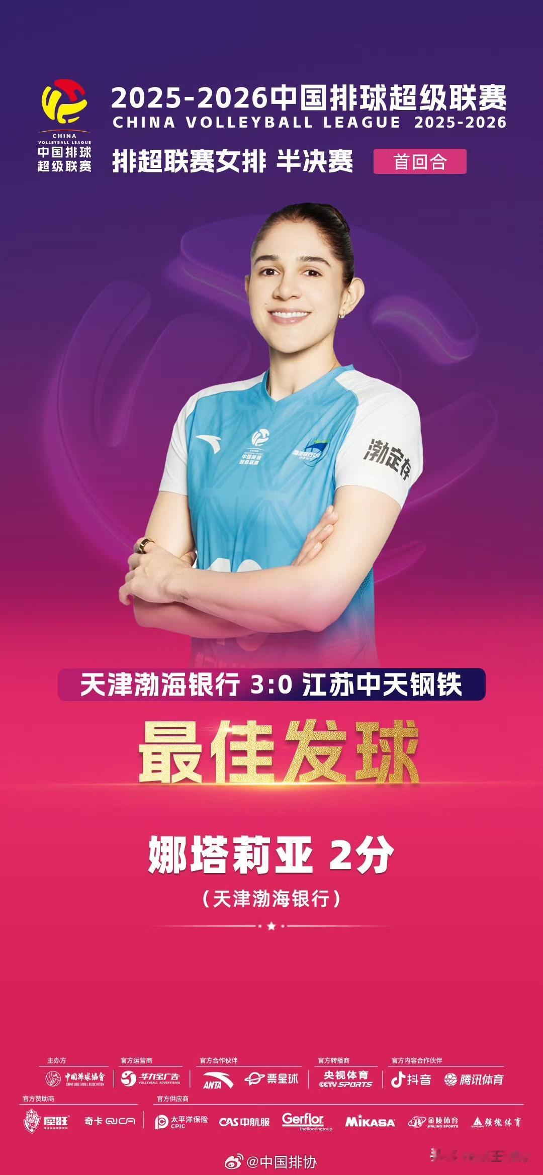 最佳发球:娜塔莉亚(天津渤海银行)2分,19次发球、2得分1失误。