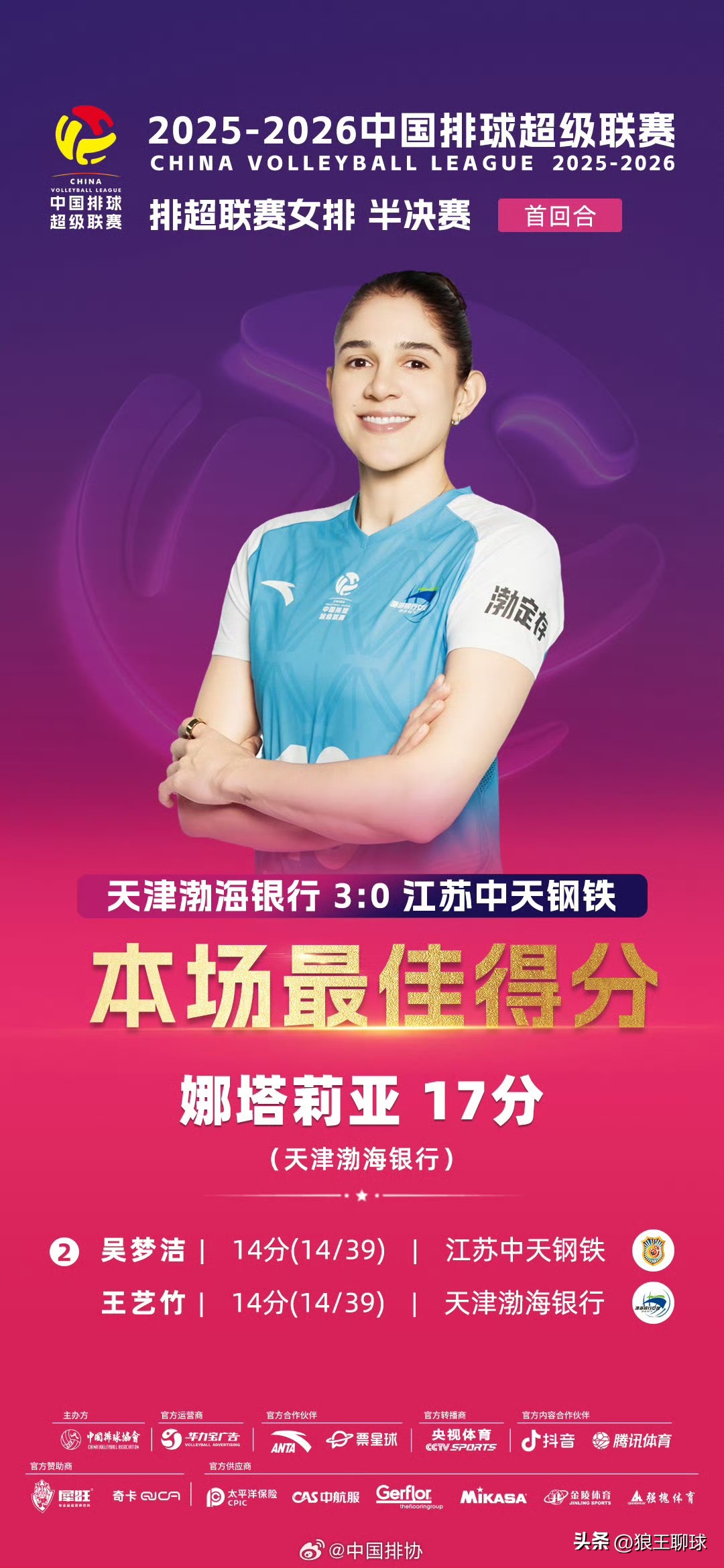2025-2026赛季中国女子排球超级联赛,A级总决赛半决赛首回合天津渤海银行主场对决江苏女排,李盈莹受伤缺席,王媛媛留洋土耳其超级联赛加拉塔萨雷俱乐部,而江苏女排是上赛季联赛冠军、去年全运会冠军,吴梦洁、唐欣、万梓月、张籽萱、倪非凡、范泊宁等国手云集,半决赛天津女排在不被看好的情况下,3比0零封江苏中天钢铁,令人吃惊,确实没有想到。