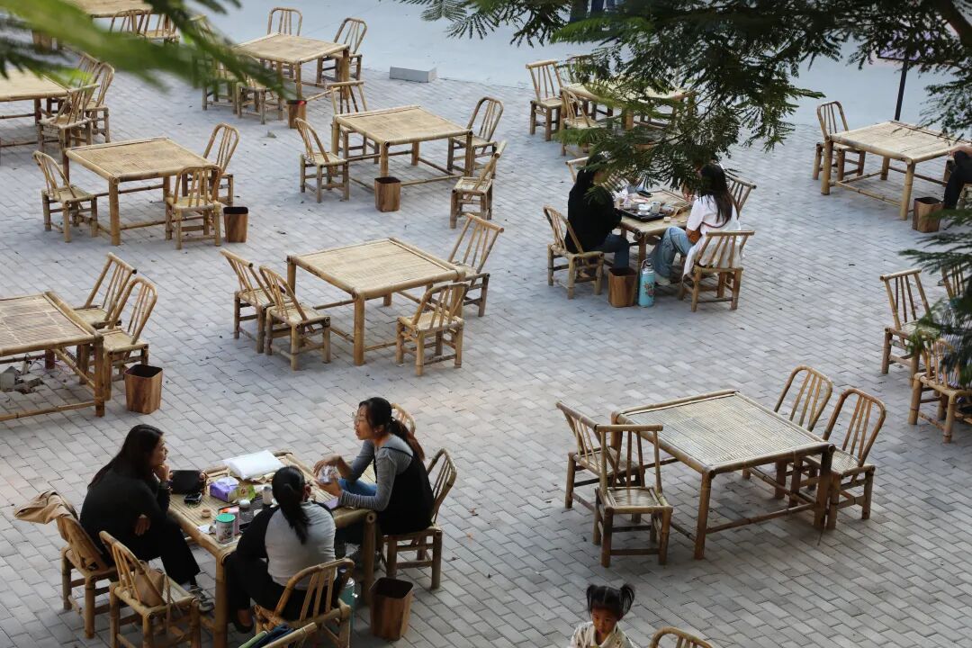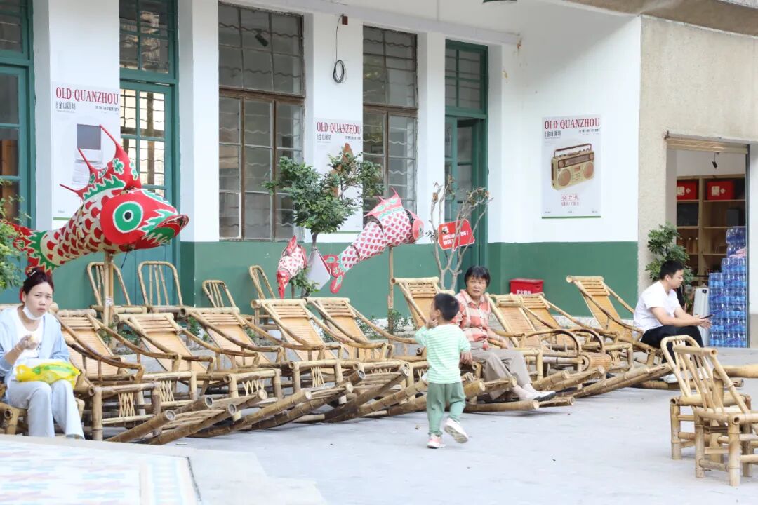 如今走进金山街坊,仿佛一脚踏入时光隧道。开阔的大广场上,几十张竹桌竹凳整齐摆放,市民游客围坐品茶,品尝从“绿皮中巴车”造型餐车中端出来的古早味美食。榕树下,孩子们追逐打闹,笑声阵阵;竹编摇椅上,居民闲话家常;复古路牌和小卖部等布景前,不少人忙着拍照留念,定格美好瞬间。室内空间同样精心规划,一二楼打造为茶馆和复古主题区域,三楼则被改造为多功能教室,定期开展非遗手工课等特色活动,实现了空间的高效复合利用。