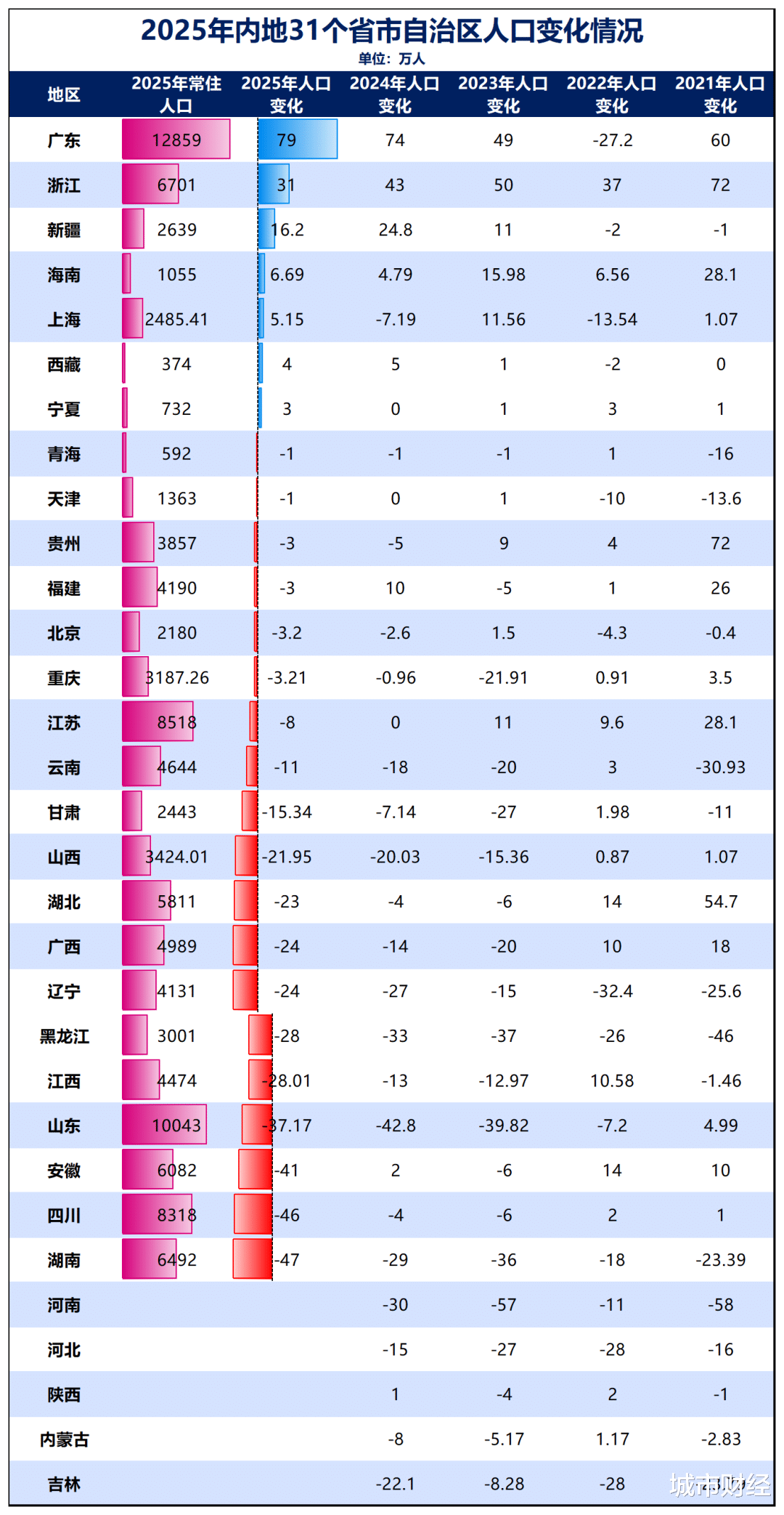 目前全国有21个地区公布了2025年常住人口数据,其中: