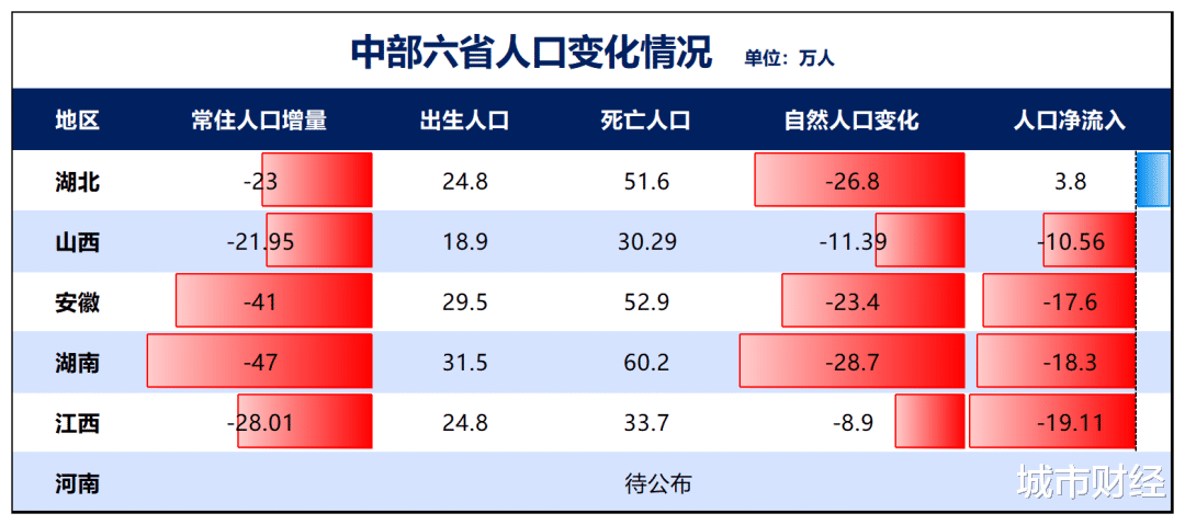 江西、安徽、山西、河南的人口减少,和湖南一样,都是自然人口减少与人口净流出叠加所致。