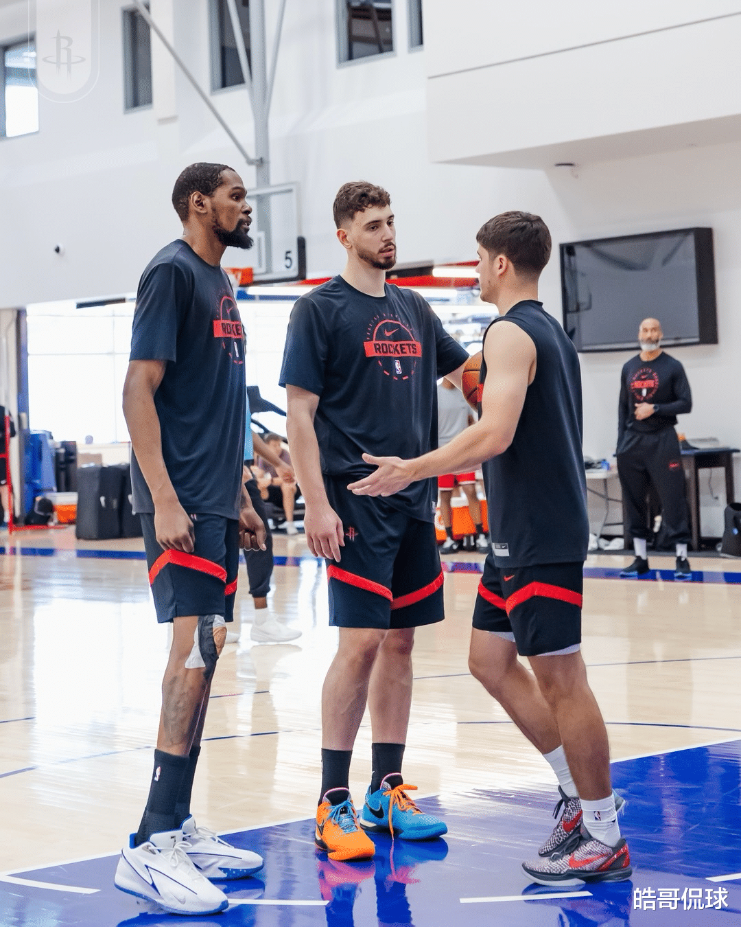 不仅如此,火箭队官方也爆出了队内训练的照片,照片上清晰可见的是,杜兰特的右膝确实还绑着肌贴绷带,看来还是没有完全伤愈康复,火箭队范乔丹和亚当斯继续因伤缺席,其余球员都可以上场。如果第二场杜兰特右膝挫伤意外缺阵,双方的阵容残缺也势必会为G2的调整埋下伏笔。