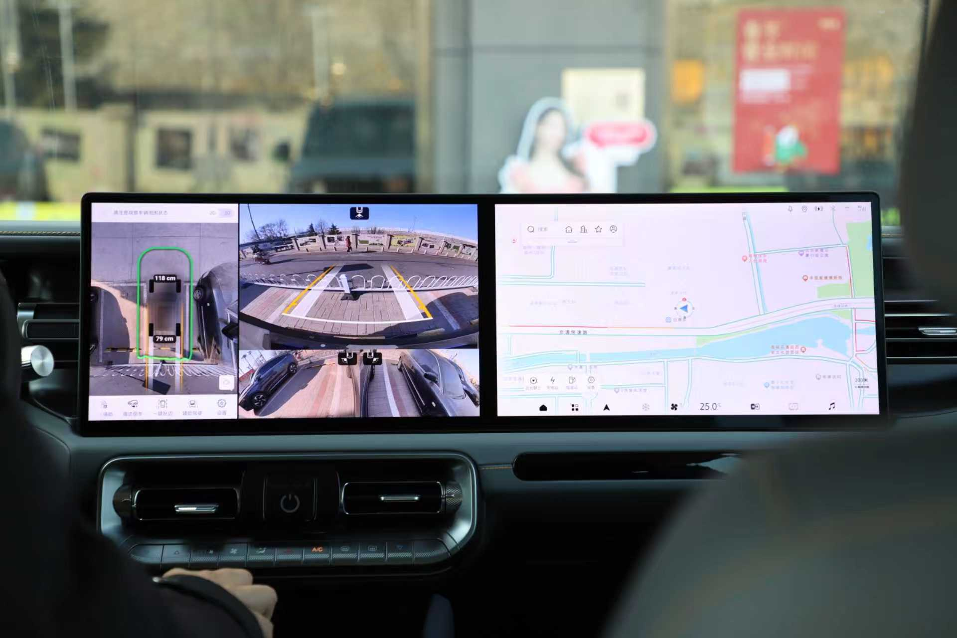 这块横贯中控的大屏,在二代8155芯片的驱动下,操作流畅、界面清晰。在越野途中,它不只是娱乐工具,更是信息中枢——高德地图能精准显示前方路径,360°全景影像配合180°透明底盘功能,可全屏或分屏高清呈现车辆四周及底盘下方状况。面对碎石、深坑或狭窄弯道,这种“上帝视角”大幅降低了误判风险,也让刚入门的玩家多了一份信心。
