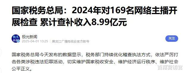 当然,白冰不是第一个,也不会是最后一个。2024年,税务部门对169名网络主播开展检查,累计查补收入8.99亿元。这个数字触目惊心。