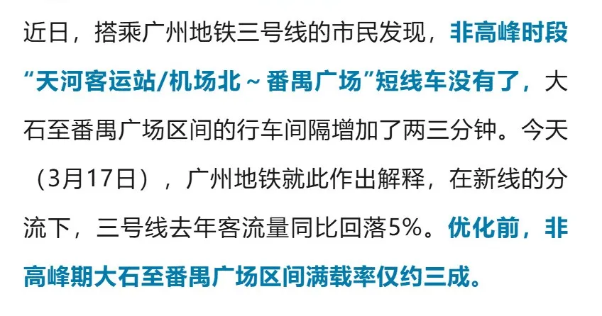 在新线的分流下,三号线去年客流量同比回落5%。优化前,非高峰期大石至番禺广场区间满载率仅约三成。