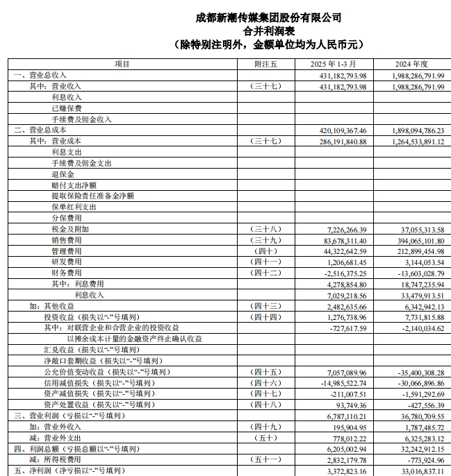 看利润表,我们会发现,2024年全年,新潮的营业收入约19.88亿(四舍五入保留两位小数,下同),营业总成本约18.98亿,基本还是在盈亏平衡线上挣扎。