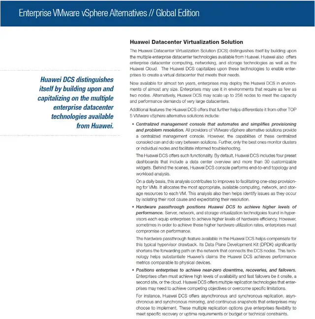 此外,DCS还通过网卡直通、NUMA优化、大页内存等特性,实现单虚拟机内业务处理和网络转发时延大幅优化,达到证券交易级性能水平。在运维管理方面,DCS实现了开放易用、软硬件全栈管理。DCS还兼容主流软硬件,如CPU、服务器、操作系统等,保护客户既有投资;并通过专业的迁移工具MigrationDirector实现业务从VMware到DCS的快速、平滑迁移。