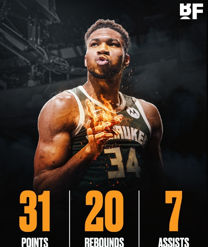 字母哥第一场比赛表现就非常炸裂,狂轰37分14篮板5助攻。在今天的比赛中,字母哥依旧勇猛无比,手感火热,出战38分钟,投篮14中11,其中三分2中2,罚球12中7,得到31分20篮板7助攻的大号准三双,其中还有7个前场板,正负值也高达+18全队最高。