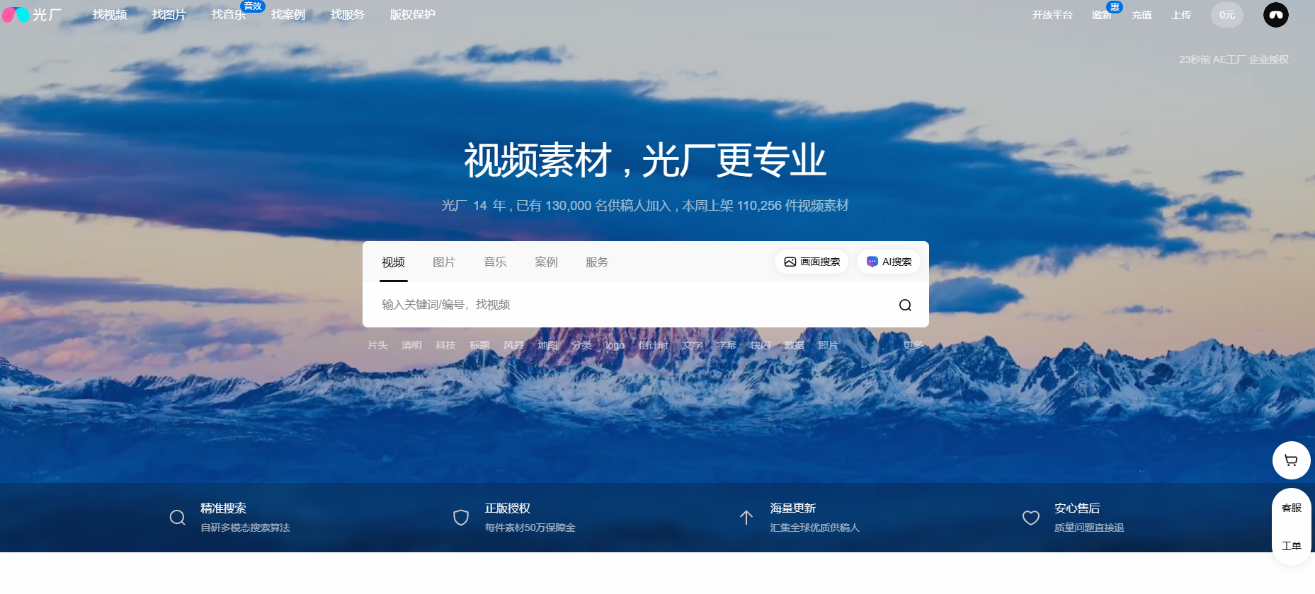 光厂是国内领先的视频素材平台,特点是专业、商用授权清晰、价格灵活。