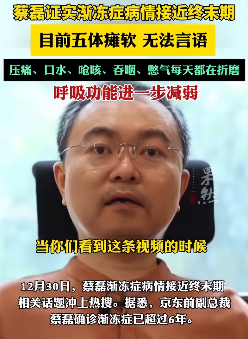 与王帅的绝望告别形成鲜明对照的,是蔡磊在渐冻症面前,那份钢铁般的意志与破釜沉舟的抗争。六年前,一纸肌萎缩侧索硬化症(ALS)的确诊通知书,如同一声惊雷,击碎了他事业鼎盛的人生轨迹。这种被称为“渐冻症”的绝症,如同无形的寒冰,从四肢末端慢慢蔓延,一点点冻结运动神经元的功能,让肌肉逐渐萎缩、肢体日渐无力,最终累及吞咽与呼吸,却始终不伤害患者的意识与认知,它最残忍的地方,就是让患者清醒地看着自己的身体被一点点“禁锢”,却无能为力,只能眼睁睁看着自己一步步走向枯萎。