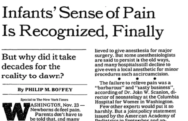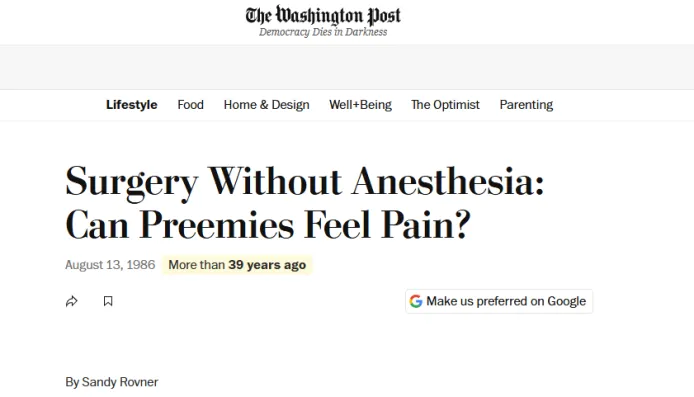有了这些“科学证据”,临床实践中的做法也就顺理成章了。1987年《纽约时报》的一项调查显示:1954年至1983年间,高达77%的早产儿动脉导管未闭手术仅使用肌肉松弛剂和笑气,没有任何真正的麻醉或镇痛。医生们的逻辑是:麻醉对婴儿的心脏和呼吸有高风险,与其冒着“把病人治死”的风险去缓解一种“不存在”的疼痛,不如干脆不用。