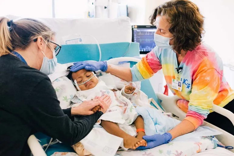 图:按摩师(右)为婴幼儿进行轻柔按摩,以缓解其腹部疼痛(图源:UCSF杂志)