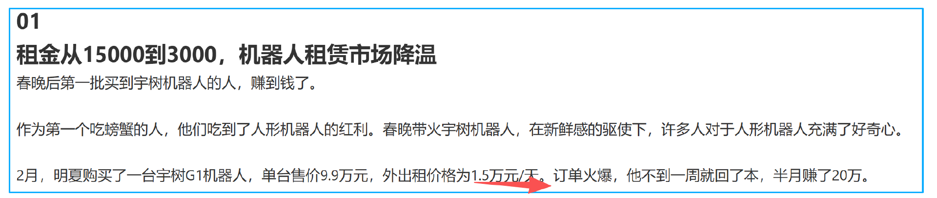 市场表现同样亮眼,截至2024年12月,宇树科技的四足机器人以超60%的全球出货量占据行业主导地位,人形机器人业务同步加速推进。商业价值方面,机器人出租服务悄然兴起,最高日租金达1.5万元的高价下,依然呈现供不应求的火爆态势。