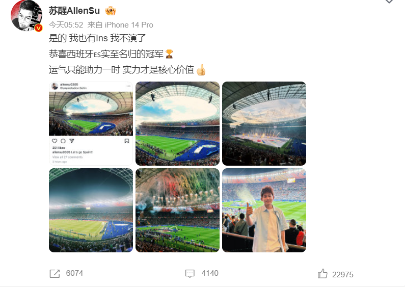 在西班牙与意大利的决赛中,苏醒和张远为西班牙队加油助威,最终见证了西班牙队的夺冠时刻。他们激动不已,纷纷在社交媒体上发文祝贺西班牙队实至名归的冠军,并感慨运气只能助力一时,实力才是核心价值。他们的感慨不仅表达了对足球比赛的热爱,更展现了对兄弟情谊的珍视。