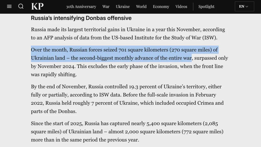 整个11月,俄军夺取里701平方千米(270平方英里)的土地,这是自开战以来第2大规模的单月推进,仅次于2024年11月的记录。这还不包括战争初期,当时前线的局势正迅速变化。