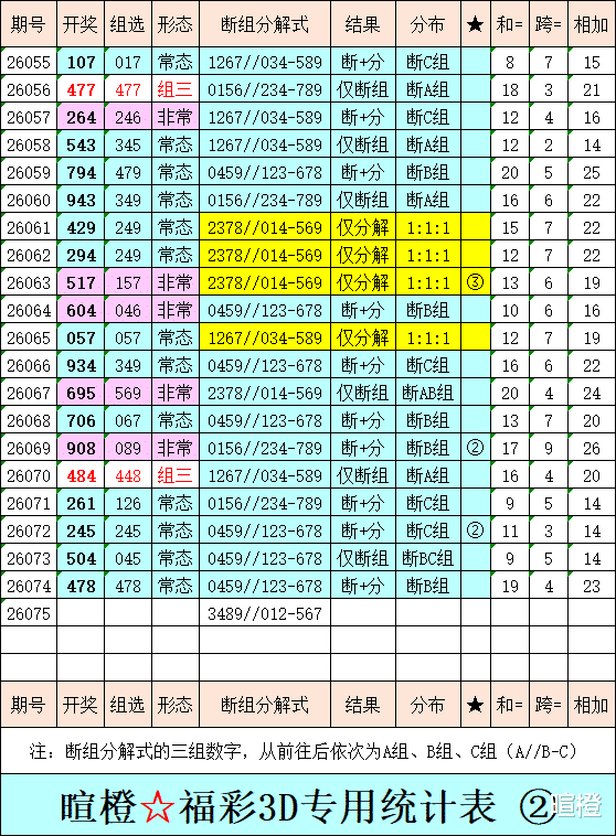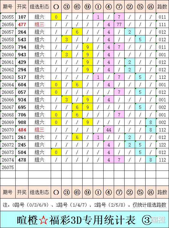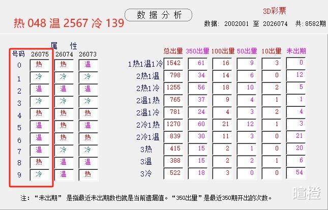 26075期:暄橙福彩3D综合条件(本期将在3月26日21:15开)一、上期回顾 ☆1、上期开奖号:4 7 8。2、和值= 19,跨度= 4。3、常态组六,112路组合。4、热度分布(热:温:冷)1:1:1。二、本期条件 ☆1、三期缺码:1369。2、热:048,温:2567,冷:139。3、断组分解式:3489//012-567。4、四胆:0689;三胆:089。三、术语解释 ☆1、三期缺码:0至9这十个自然数当中,未在近三期开奖号出现的数字。2、热度(热温冷):自然数0至9,在近七期开奖号中,出现3次及3次以上的数字,称为热码;出现2次的数字,称为温码;出现1次和未出现的数字,称为冷码。某个数字在开奖号中出现几个,就按几次计算。3、断组分解式:将0至9这十个自然数,分成三组数字,从前往后依次为A组(4码)、B组(3码)、C组(3码),一般情况下,有一组数字不出码,偶尔会有两组数字不出码。A组不出码的情况相对较少。断组为主,分解为辅。4、常态组六号码:同时包含大数、小数、奇数、偶数、质数、合数的组六号码,共有72注。统计表中,简称“常态”。5、非常态组六号码:全大数、全小数、全奇数、全偶数、全质数、全合数等六种形态的组六号码,共有48注。统计表中,简称“非常”。★提醒:彩市有风险,参与须谨慎!水平有限,仅供参考!
