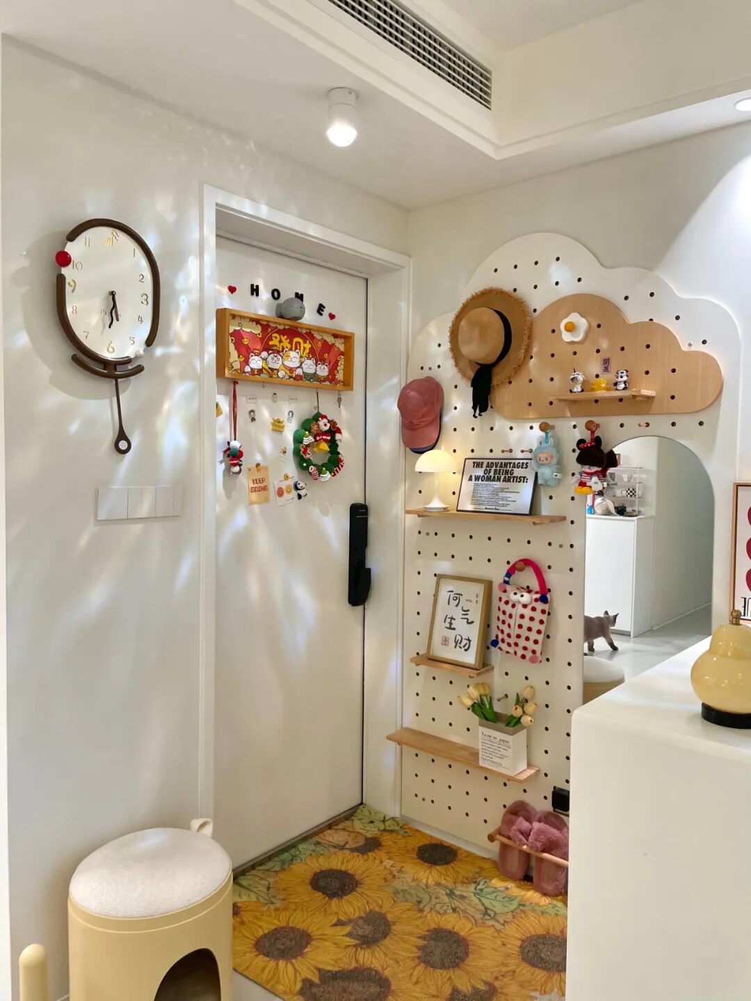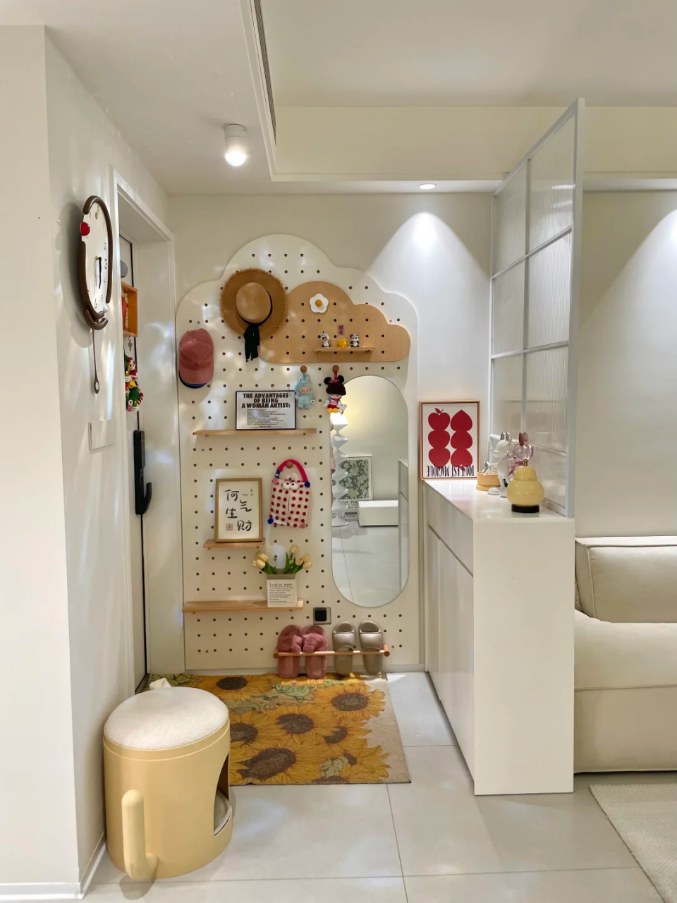 侧面墙安装了洞洞板,既能当装饰,又能挂包包、钥匙,还加了穿衣镜在上面,出门前整理穿搭超方便,好看又实用。