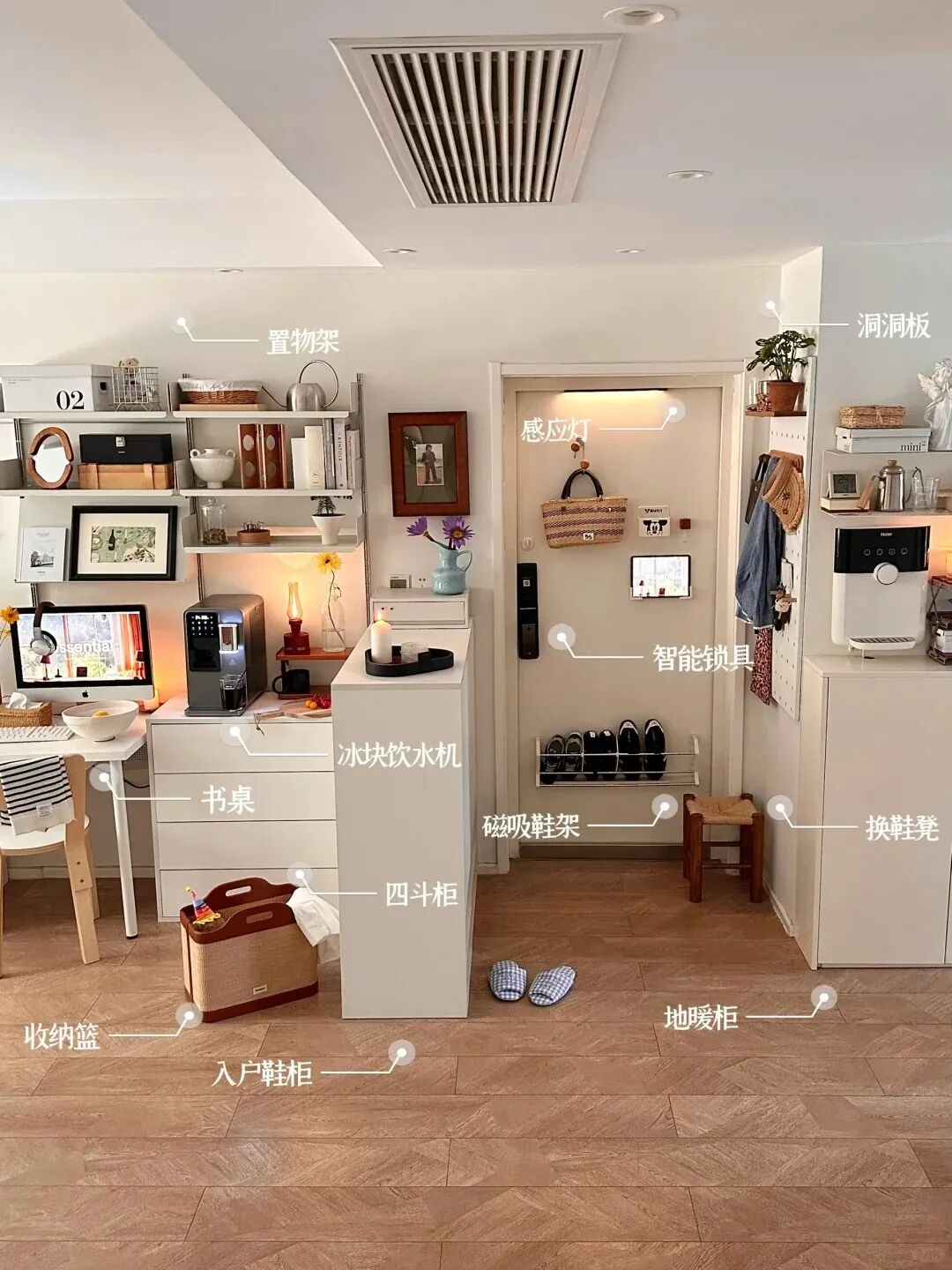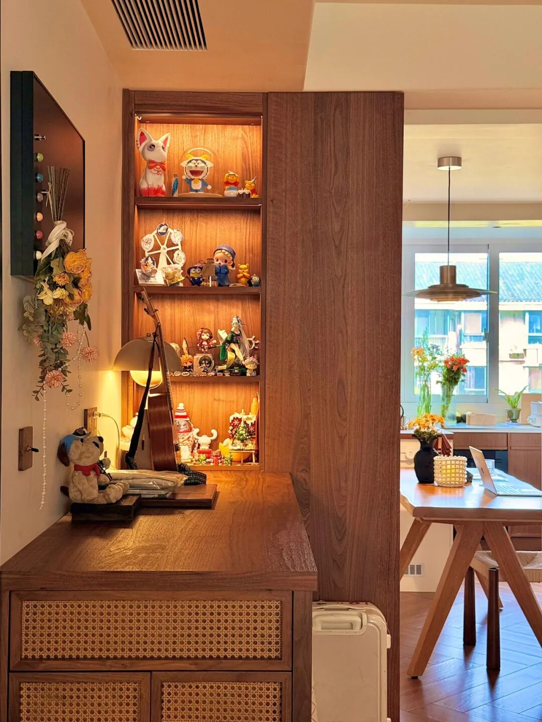 最贴心的是玄关矮柜上方的台面,功能可以随意切换,放小电器、音箱、放摆件,甚至是书和小工具,想怎么用就怎么用。