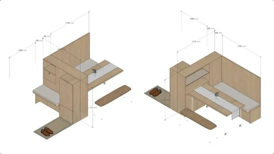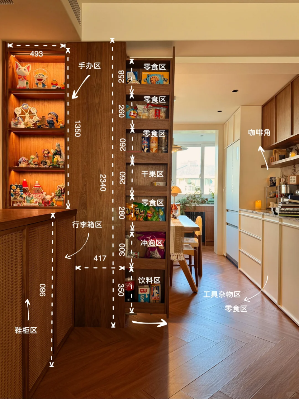 面向玄关这边做鞋柜,放一家三口的日常鞋子,面向餐厅那边做餐边柜和水吧台,柜子里装下所有的杯子,茶具,咖啡和茶,还有一些吃饭会用到的小工具。