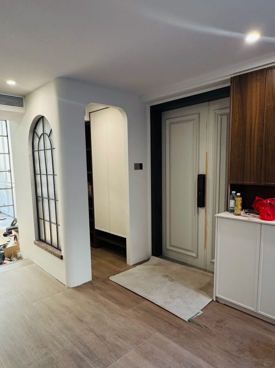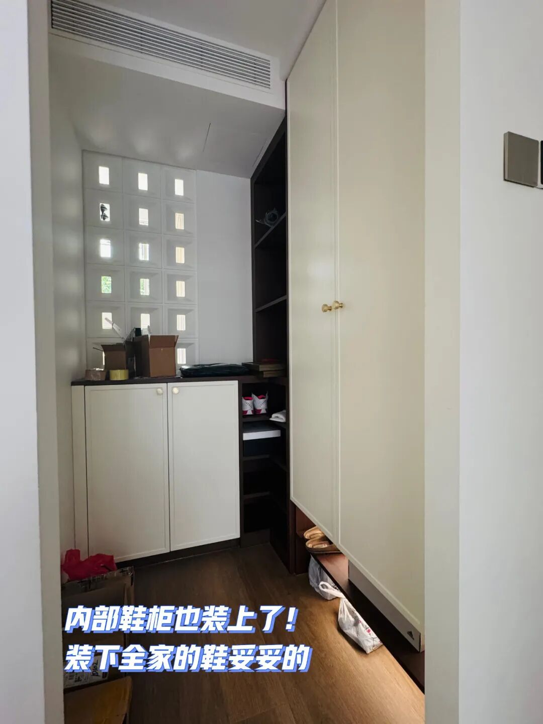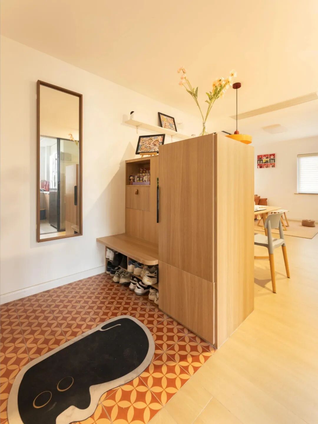 新房最大的问题就是一字户型,没玄关,可家里两个孩子,鞋子杂物多,决定平地造玄关。
