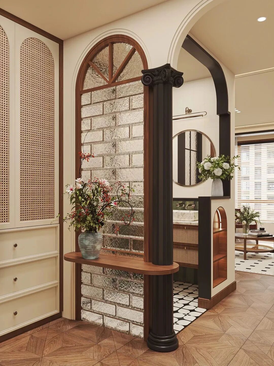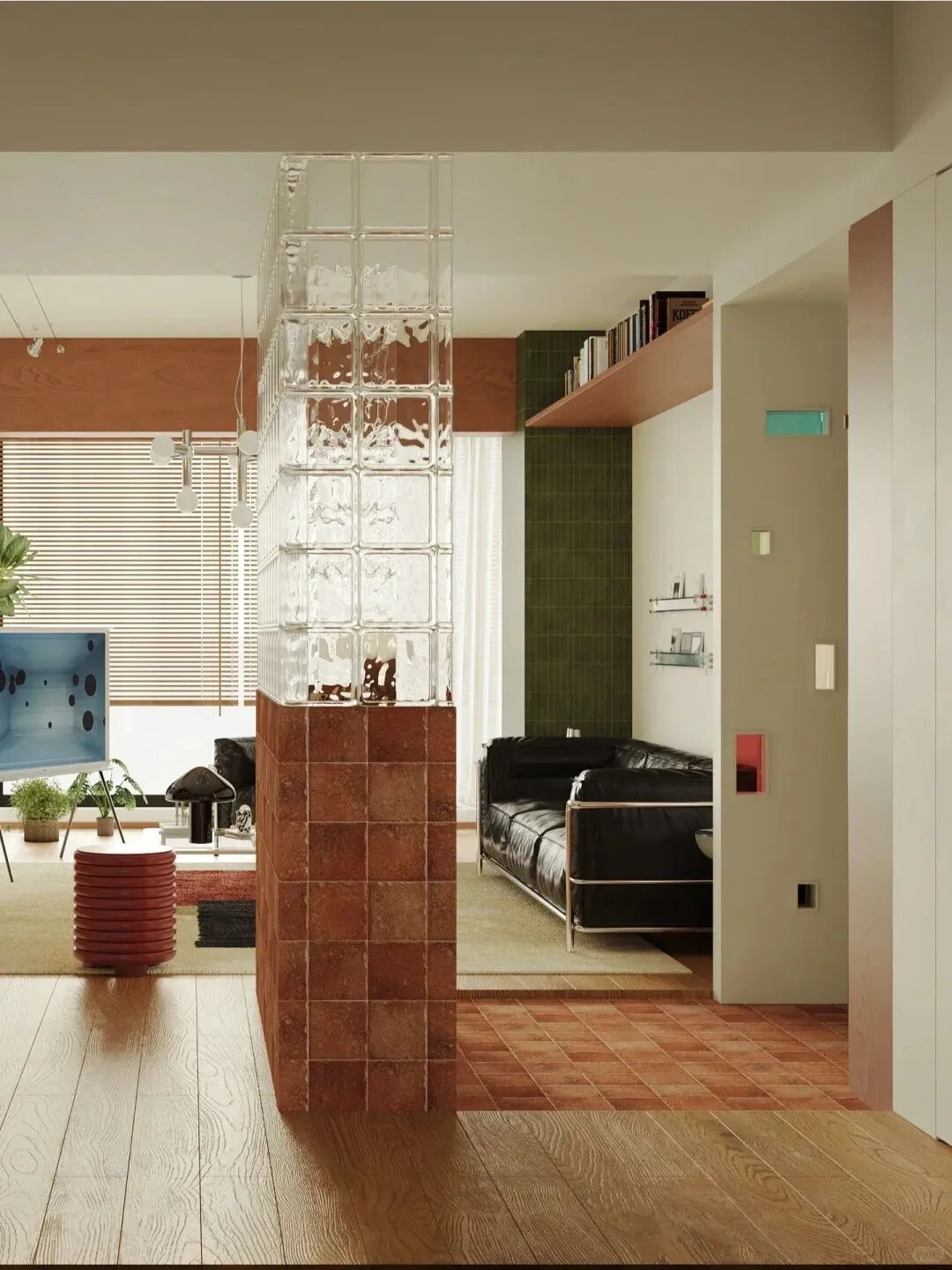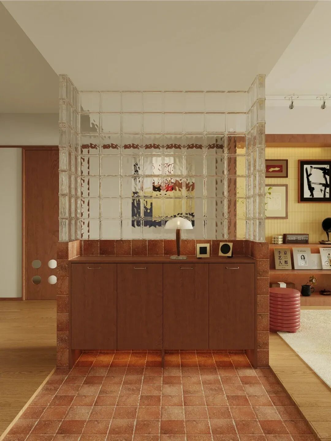 用半墙+玻璃砖的组合造个玄关,既保证了入户隐私,玻璃砖又不会挡住光线,全屋依旧通透亮堂。