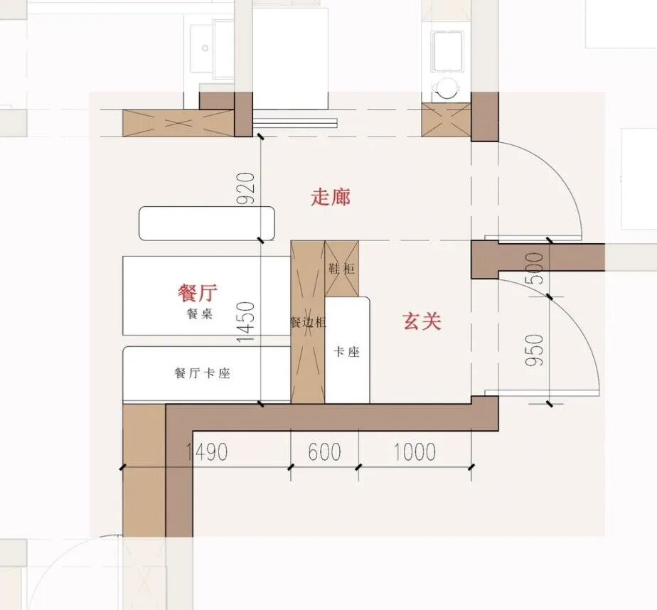 家里玄关刚好和餐厅相接,所以特意设计了双面卡座的玄关,不仅餐厅有了座位,换鞋也有了专门的位置,再也不用“金鸡独立”了。