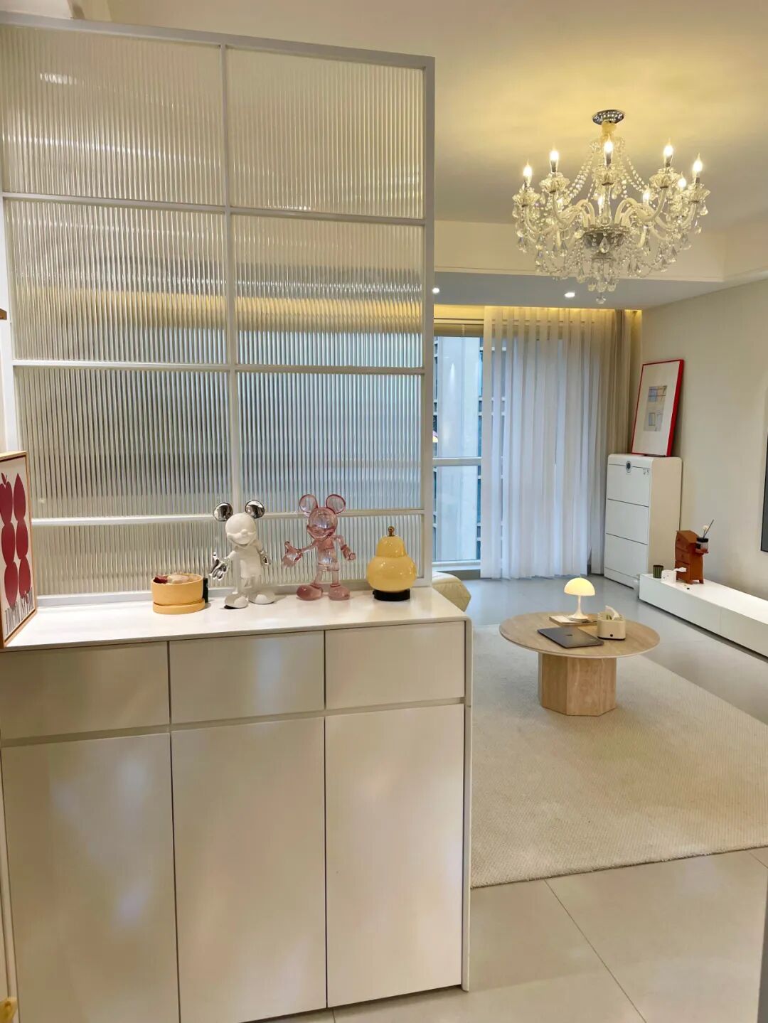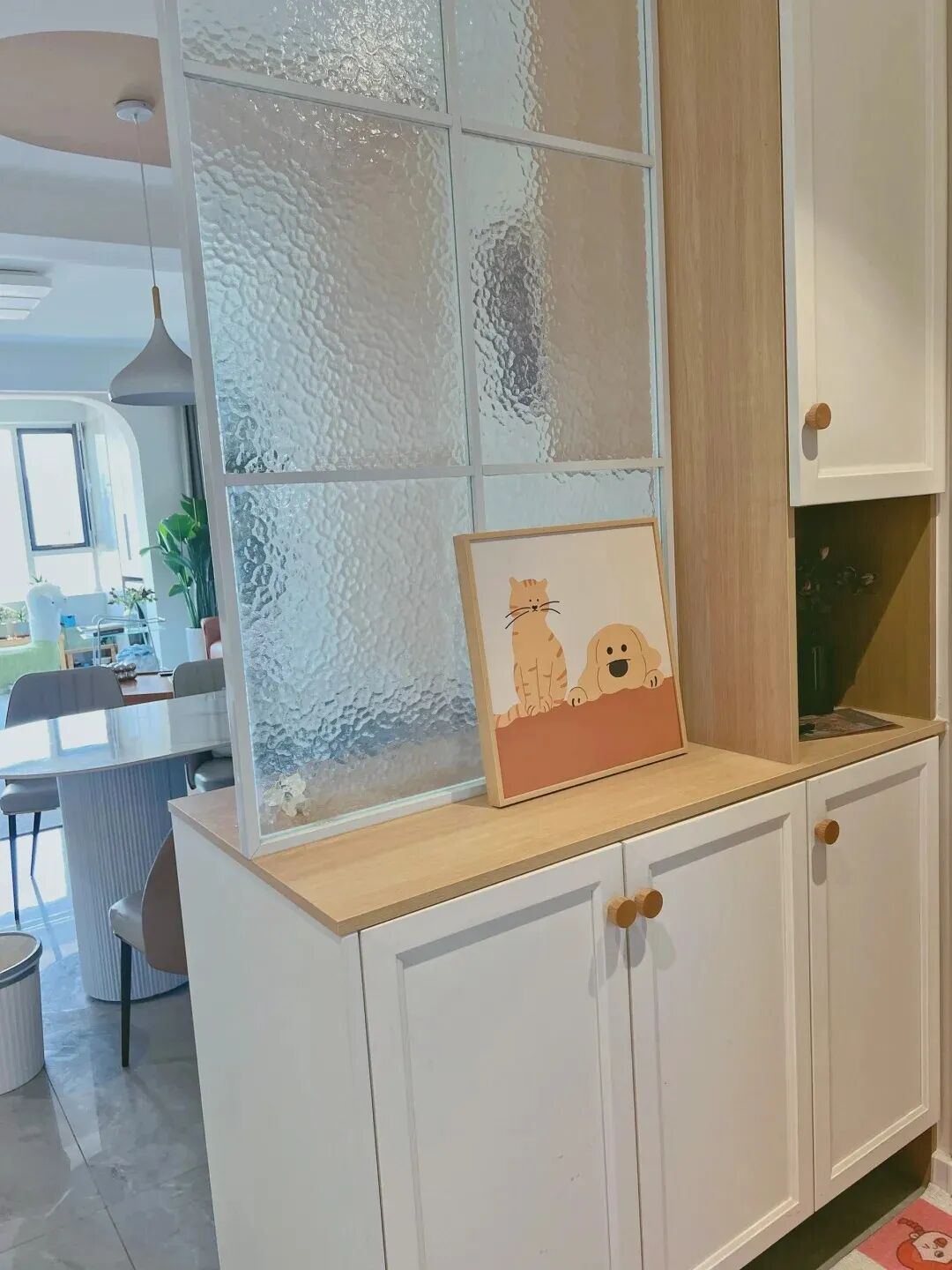 玻璃屏风装在台面中间,这样台面两边都能使用,钥匙、手机、包包全有地方放,再也不用攥着手机艰难换鞋了。