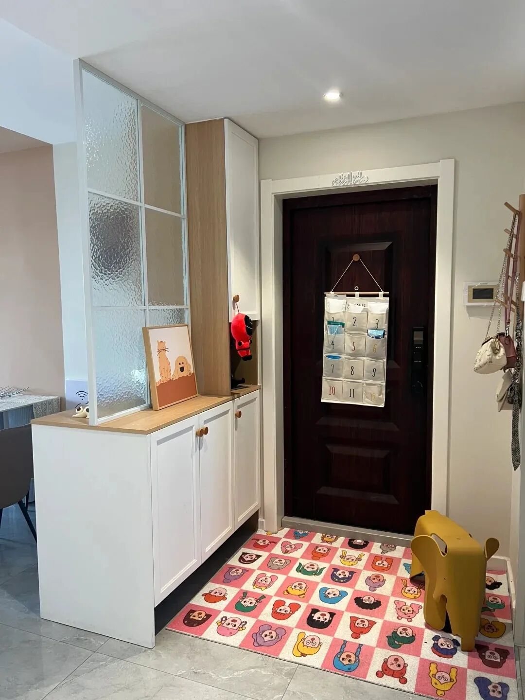 我家入户开门正对客厅,而且进门左侧墙面太窄,根本做不了鞋柜,为了美观和实用,就在入户正对面做了成品的半高鞋柜+玻璃隔断设计,满足了日常放鞋需求,还不影响入户采光。