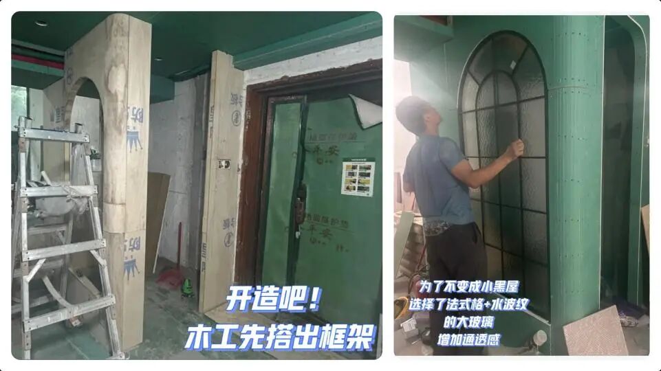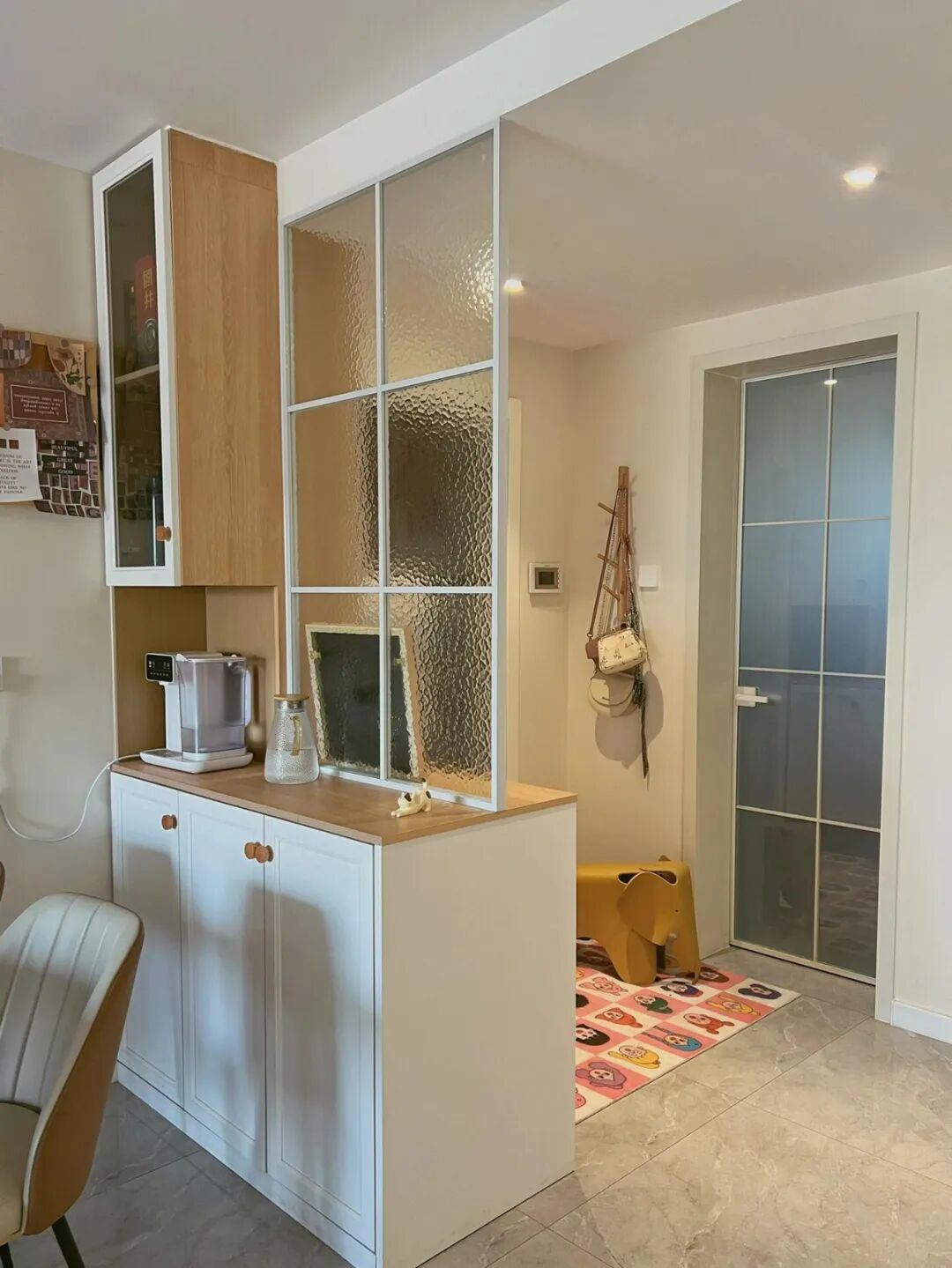 让木工搭出个框架,选择了法式格+水波纹的大玻璃增加通透感,由此家里就有了一个800库一样的收纳区。