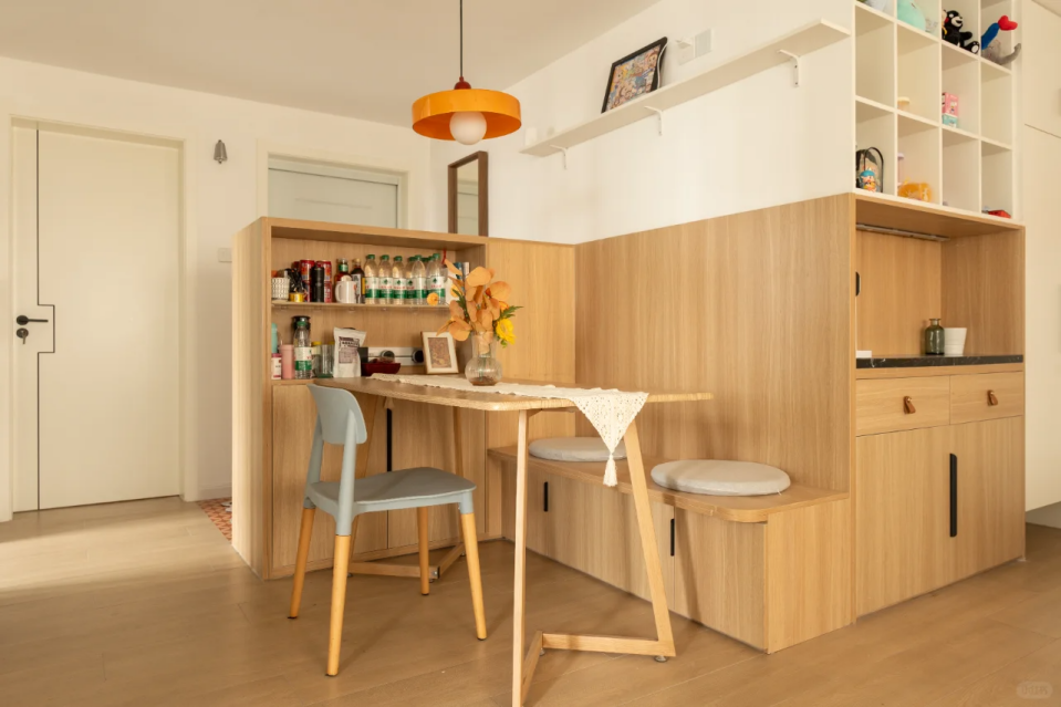 背面搭配餐桌,直接变身餐厅,一举两得,小空间这样做真的省空间又实用。