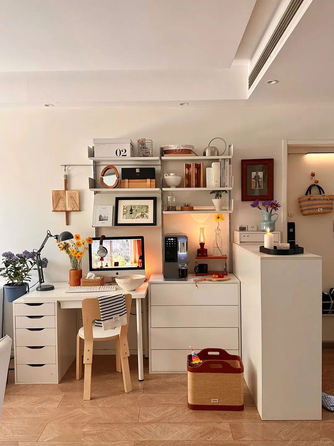 家里是小户型,没有单独的空间做书房,但一直想有一个单独的书桌办公区和水吧台。我家这个鞋柜书桌一体的设计,直接把空间利用率拉满!