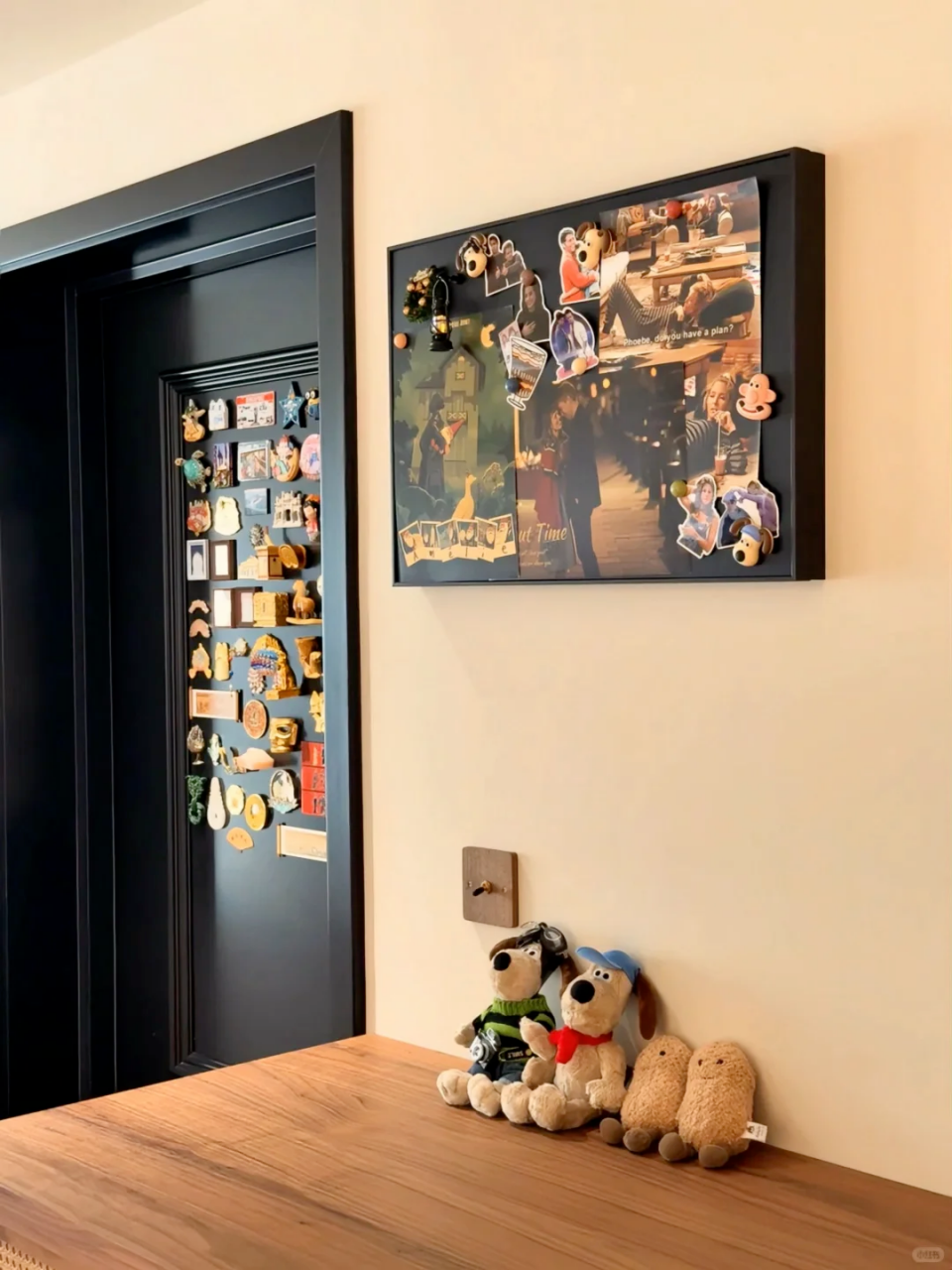 墙面的电表箱加了一层磁吸黑板,内有液压气撑,方便开合,上面可以用粉笔涂鸦、贴备忘录和照片等,下面可以磁吸挂钩,收纳一些钥匙等随身小物件。