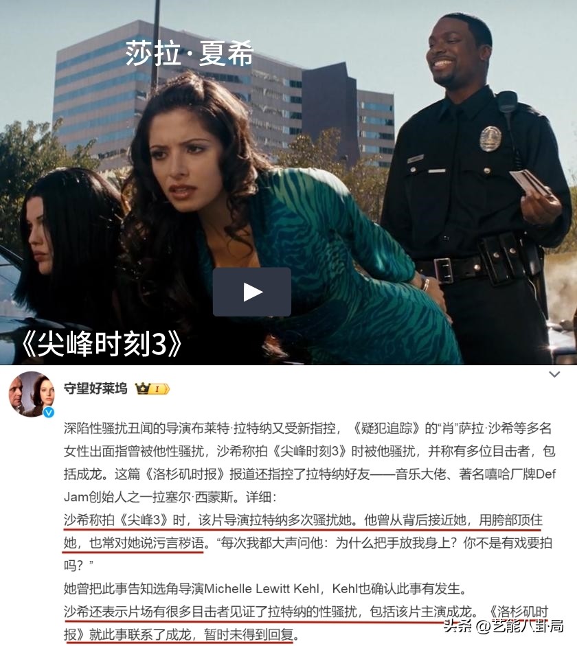《尖峰时刻3》女演员实名放锤难怪《尖峰时刻3》中的女演员莎拉·夏希,曾在接受媒体采访时,实名指控拉特纳“多次骚扰她”。