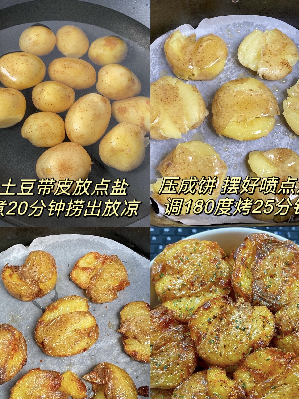懒人彩蛋:土豆可以提前煮好,放冰箱保存,早上起来直接压扁、刷油、撒香料,烤十分钟就能当早餐,省时又美味;不想刷油,可以用锡纸包住土豆烤,烤出来更嫩;香料随心换,迷迭香、百里香、罗勒叶,家里有啥用啥,都能烤出好味道。今晚就试,把土豆烤得金黄酥脆,香气飘满屋,全家抢着吃,吃完还想吃!