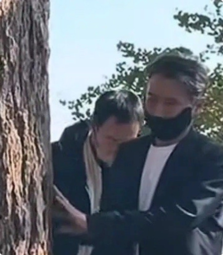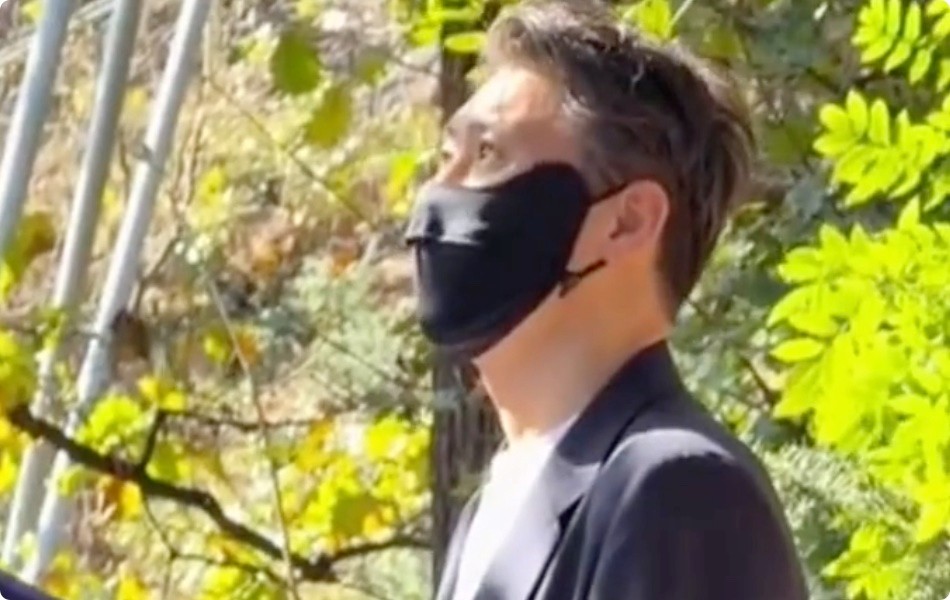 辛柏青穿着一如既往的低调,灰色休闲裤、黑色立领夹克、棒球帽,连口罩都没摘下。