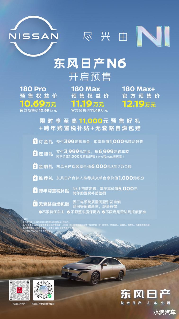 本次预售的东风日产 N6 涵盖 180 Pro、180 Max、180 Max + 三个版本,全系实现 “起步即高配”:20 度以上大电池与 180 公里纯电长续航成为标准配置。