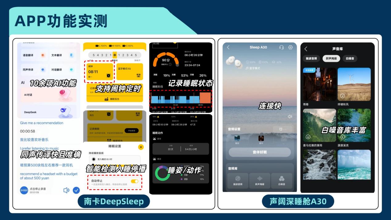 南卡DeepSleep:内置新一代蓝牙5.4芯片,连接速度快且几乎无延迟,还支持双设备间自由切换。配套APP提供蓝牙模式和睡眠模式的灵活切换,并集成十几项AI智能功能,例如同声传译反应迅速、翻译准确。在睡眠模式下,用户可以调节降噪强度,耳机会自动检测入睡状态并暂停播放,同时记录整晚的睡眠数据,包括入睡时间、浅睡与深睡比例、夜间醒来次数,以及翻身和睡姿变化。最终生成的睡眠报告直观易读,让助眠与降噪效果都有可量化的数据支撑,使用体验更加全面丰富。