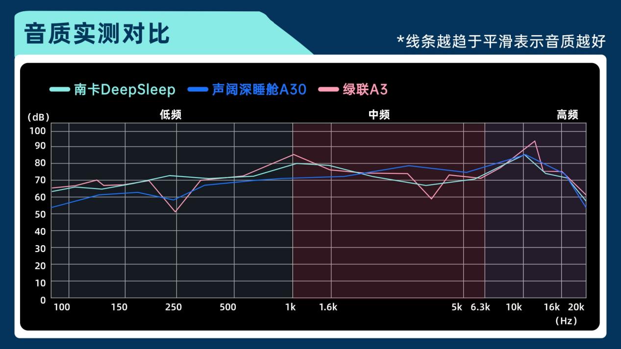 TOP2、声阔深睡舱A30:低频段的频响曲线略有波动,但中高频部分能够回归平稳,整体声音调校偏向柔和自然。中高频表现清晰细腻,人声和乐器的层次感表现不错,听流行或轻音乐时体验舒适,不会刺激耳朵,即便长时间佩戴也不易产生听觉疲劳。