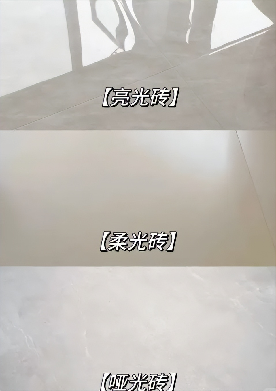 6、看材质,关于你家到底选亮光、柔光砖、还是哑光砖,不用太纠结,首先哑光后期非常难打理,不要选,家里采光差、也不爱打扫的就选亮光砖,亮光砖除除了不适合无主灯,其它简直完美。柔光砖介于两者之间,摸起来肌肤触感,和无主灯适配度高,但有翻车风险,千万别选成柔抛砖,非常容易渗色。