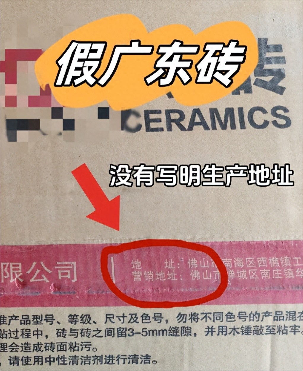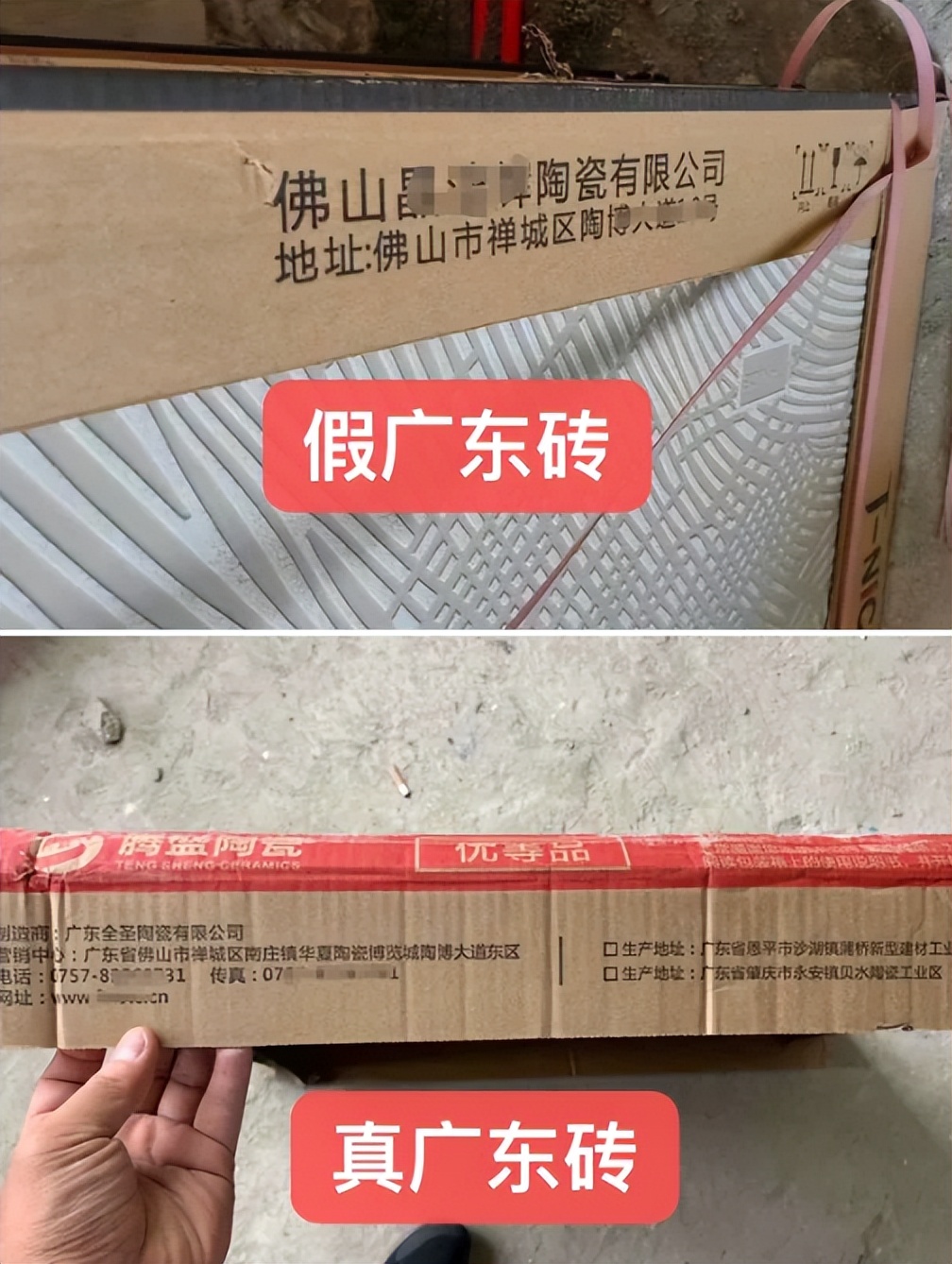 鉴别真假广东砖最简单的方法就是看包装箱,但凡包装箱上面印的是注册地址、营销地址、办公地址的,一律不是广东砖,认准生产地址和生产基地。