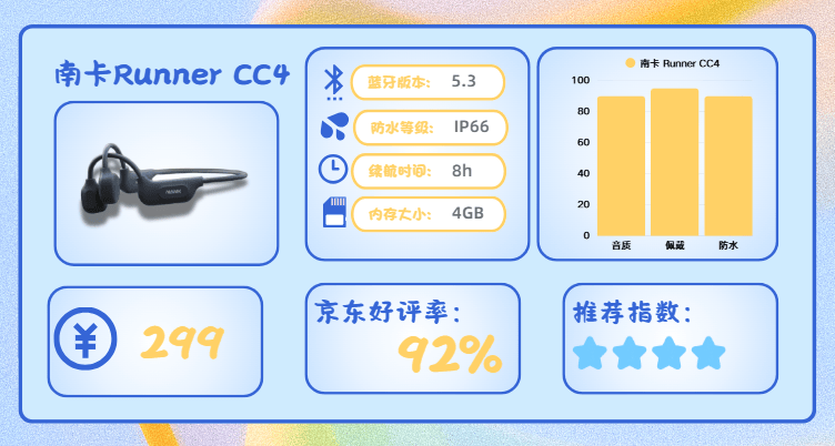 从配置和体验感来看,南卡RunnerCC4是南卡的用心之作,价格也相当实惠,是骨传导耳机当中的入门首选。